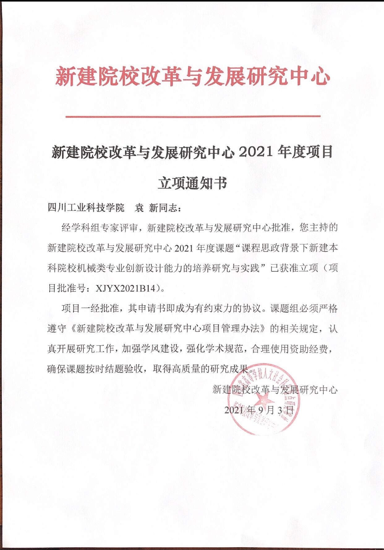 近日,四川省高等学校人文社科重点研究基地公布了新建院校改革与发展研究中心2021年度项目立项的通知。我院教师袁新申报的课题《课程思政背景下新建本科院校机械类专业创新设计能力的培养研究与实践》(项目编号:XJYX2021B14)喜获立项。
