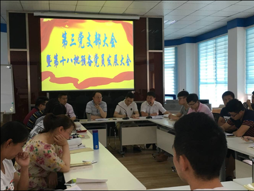 2016年5月19日13:00,第三党支部在电子商务实训中心会议室召开第三党支部大会暨第十八批预备党员发展大会。会议集中讨论了吴梦玲等7名同志发展为预备党员问题。第三党支部全体党员、部分入党积极分子和交通学院全体辅导员列席,会议由党支部副书记杨郑主持。