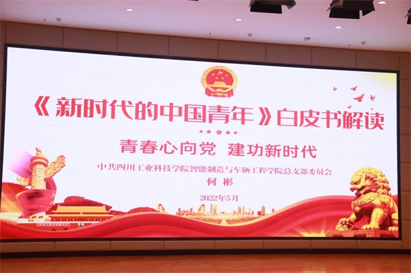5月8日下午四川工业科技学院智能制造与车辆工程学院党总支在龑江C区负一楼科技厅开展关于《新时代的中国青年》白皮书解读和学习活动,意为深入理解新时代中国青年的责任与担当。
