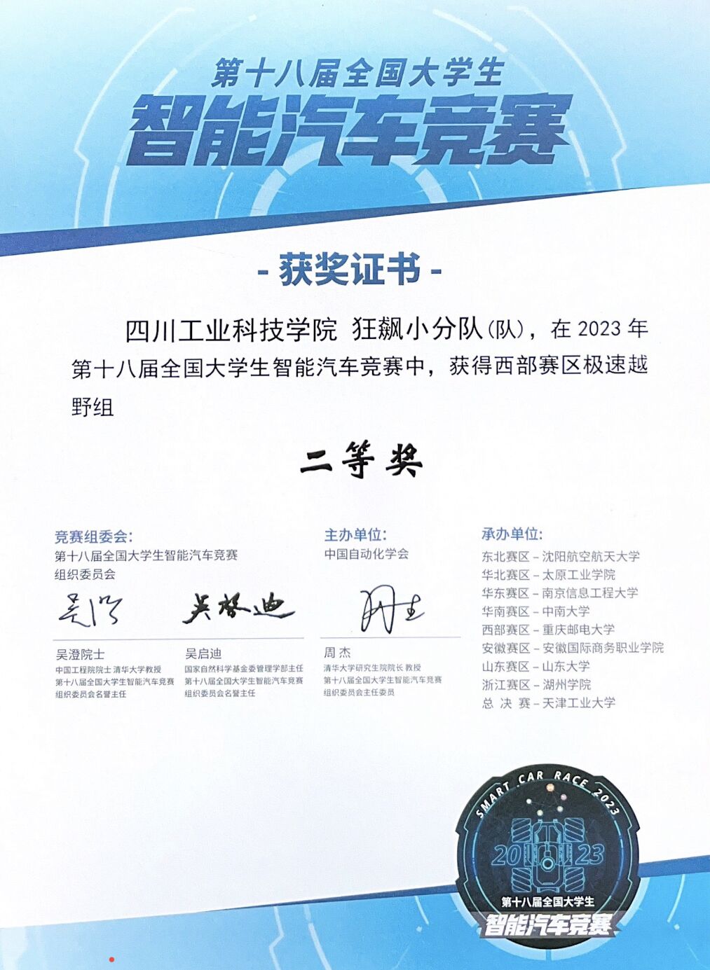 2023年7月21-23日,第十八届全国大学生智能汽车竞赛西部赛区比赛在重庆邮电大学举行。本次大赛我校共派出三支车队分别参加单车越野组、极速越野组和三轮摄像头组的比赛。在比赛过程中,同学们努力拼搏、克服困难、冷静沉着、勇于创新,经过3天的激烈角逐,三个队伍全部获得西部赛区二等奖。