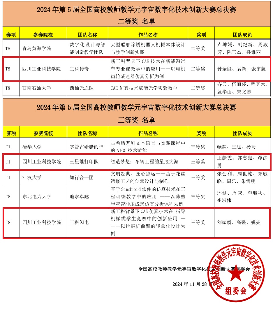 据悉本届大赛共有全国31个省/直辖市/自治区赛区各高校数百支教学团队积极报名参赛,共339支队伍入围全国总决赛,学校教师自接到竞赛通知以来积极备赛,经过初赛、复赛最终取得优异的成绩,此次大赛获奖不仅展示了参赛教师在教学创新和数字技术应用方面的优秀能力,也体现了学校在“数字”赋能教学改革上的重视。下一步,学校将继续加大对数字化教育的投入与支持力度,不断激励学校教师在教学方法和技术创新上探索,为培养新时代高素质应用型人才贡献力量。