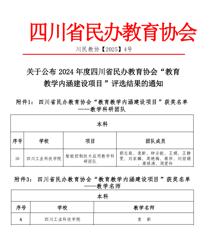 近日,四川省民办教育协会公布2024年度“教育教学内涵建设项目”评选结果。学校智能制造与车辆工程学院袁新老师荣获“教学名师”称号,郭志庭老师领衔的“智能控制技术应用教学科研团队”获评“优秀科研团队”。此次评选共收到全省民办高校申报项目243项,最终评出优秀科研团队45项、精品课程38项、教学名师44名。