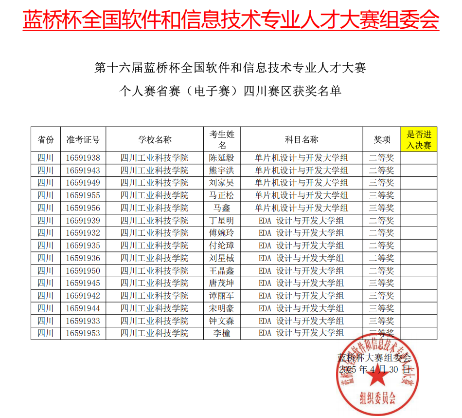 4月30日,第十六届“蓝桥杯”全国软件和信息技术专业人才大赛成绩正式公布。学院学子获得省赛二等奖7项、三等奖13项,其中在EDA设计与开发组取得突破,获二等奖5项。