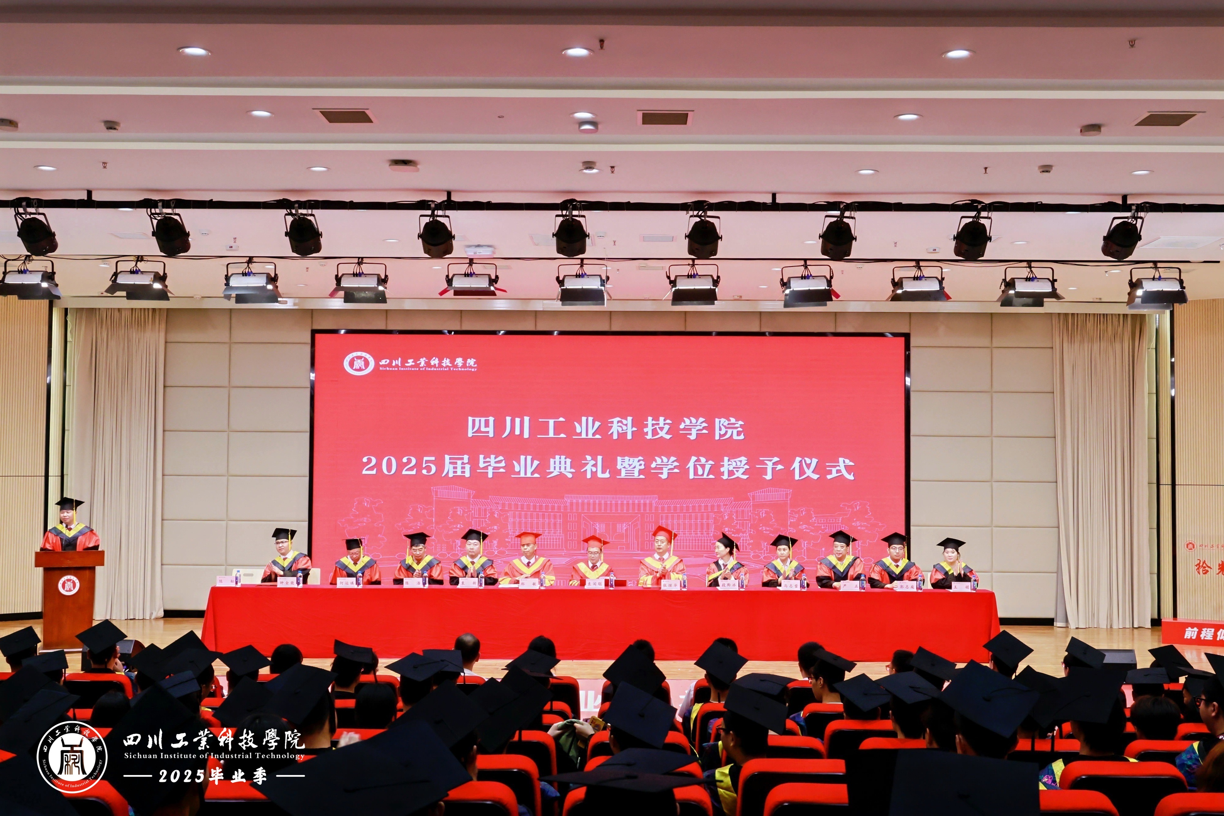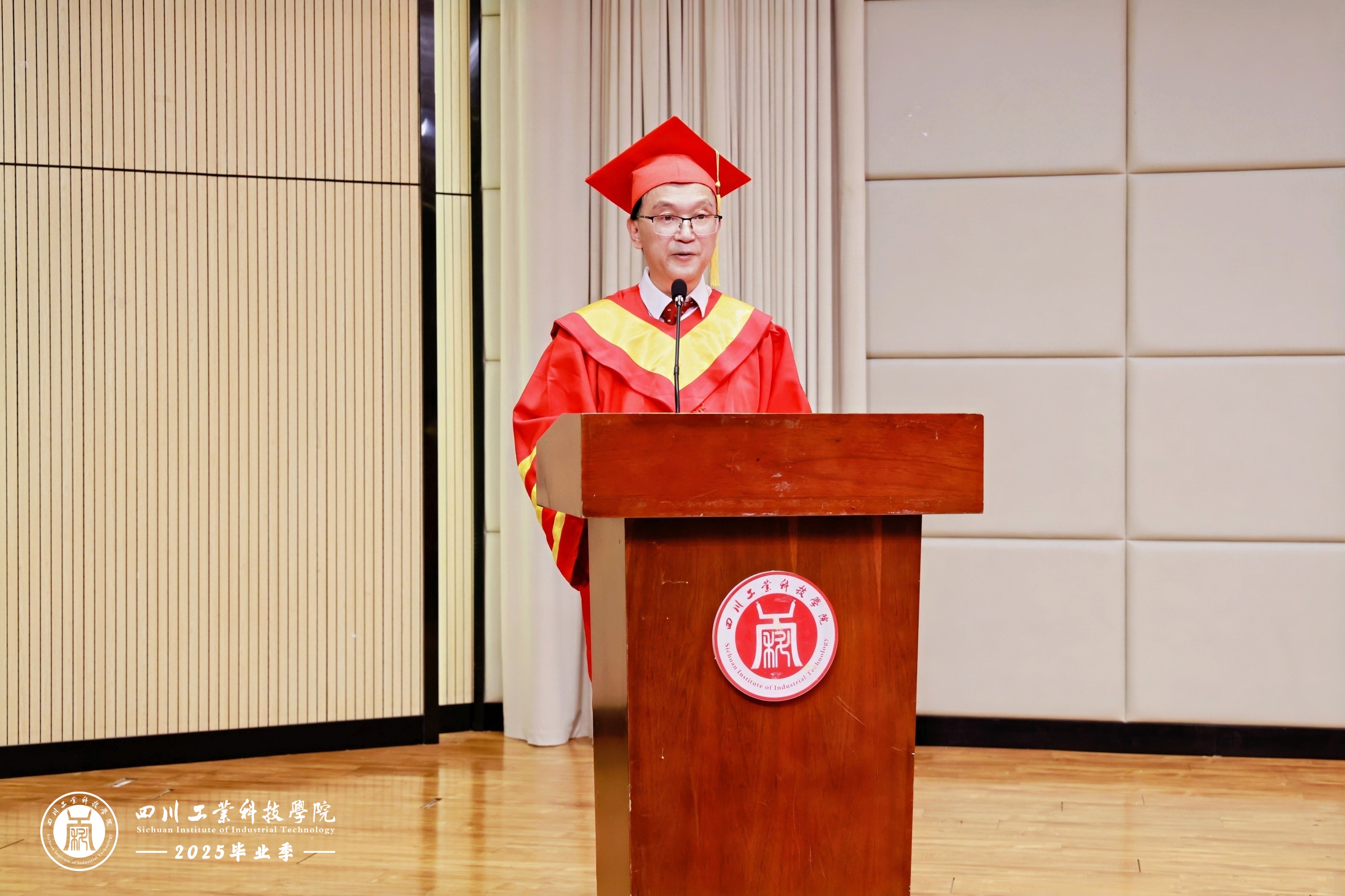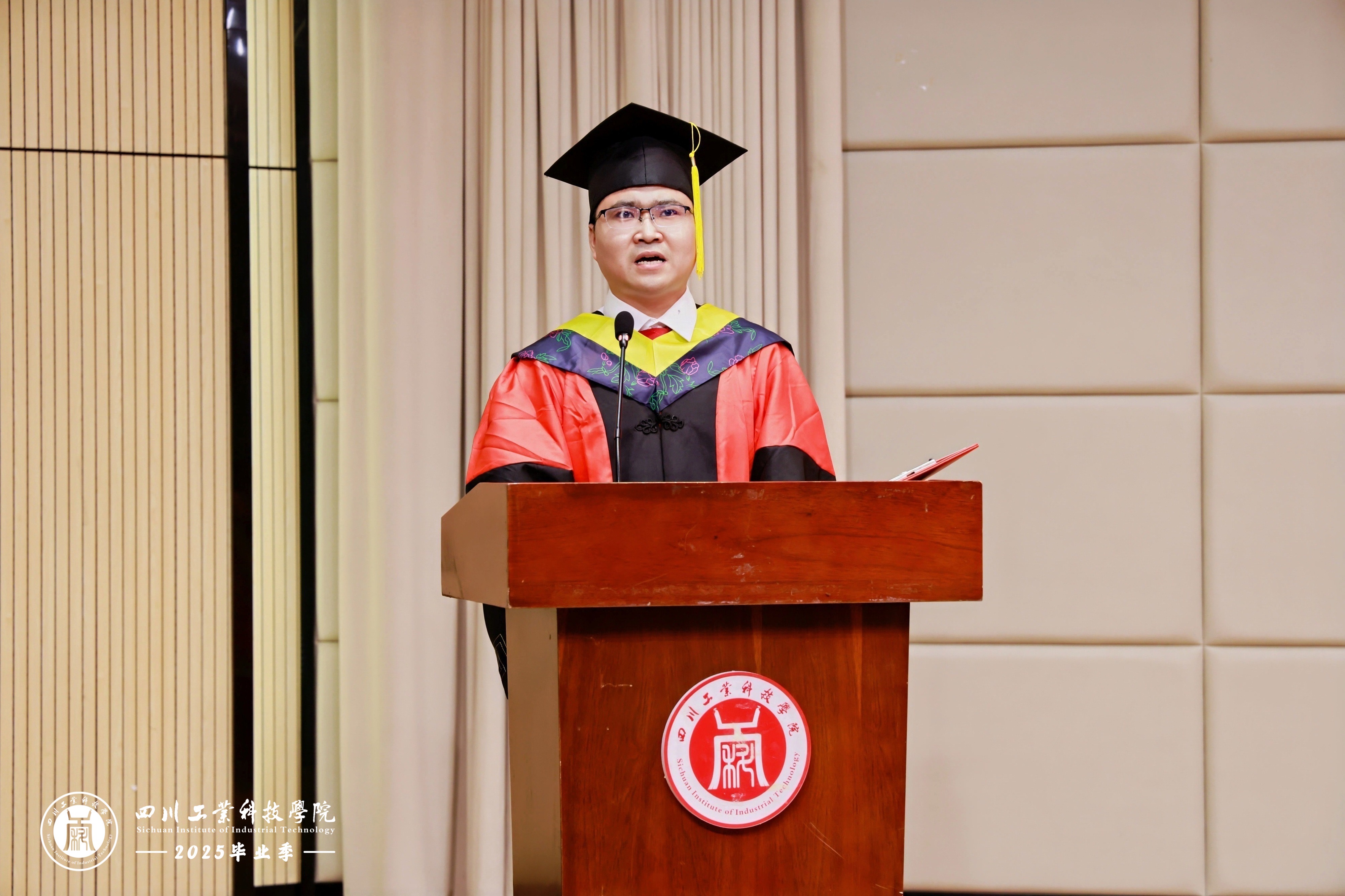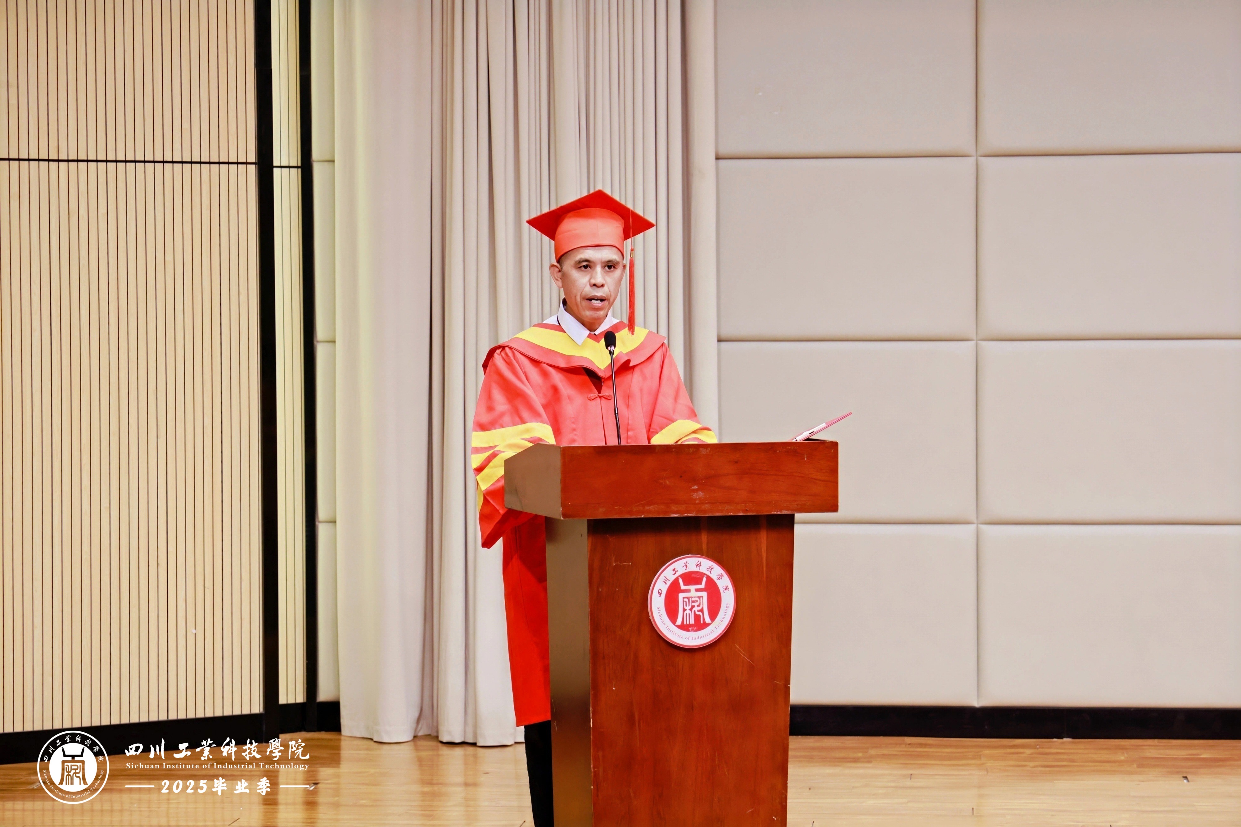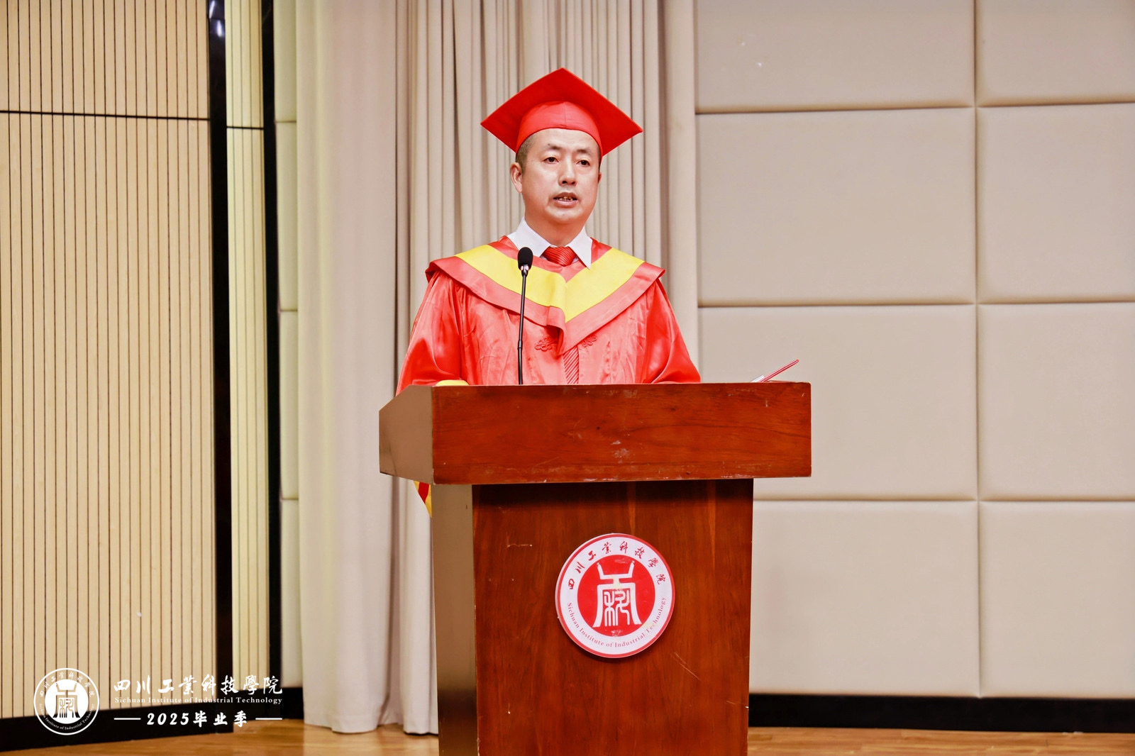 毕业典礼上,学校党委书记袁闻聪宣读《四川工业科技学院智能制造与车辆工程学院2025届省级“优秀大学毕业生”名单》。