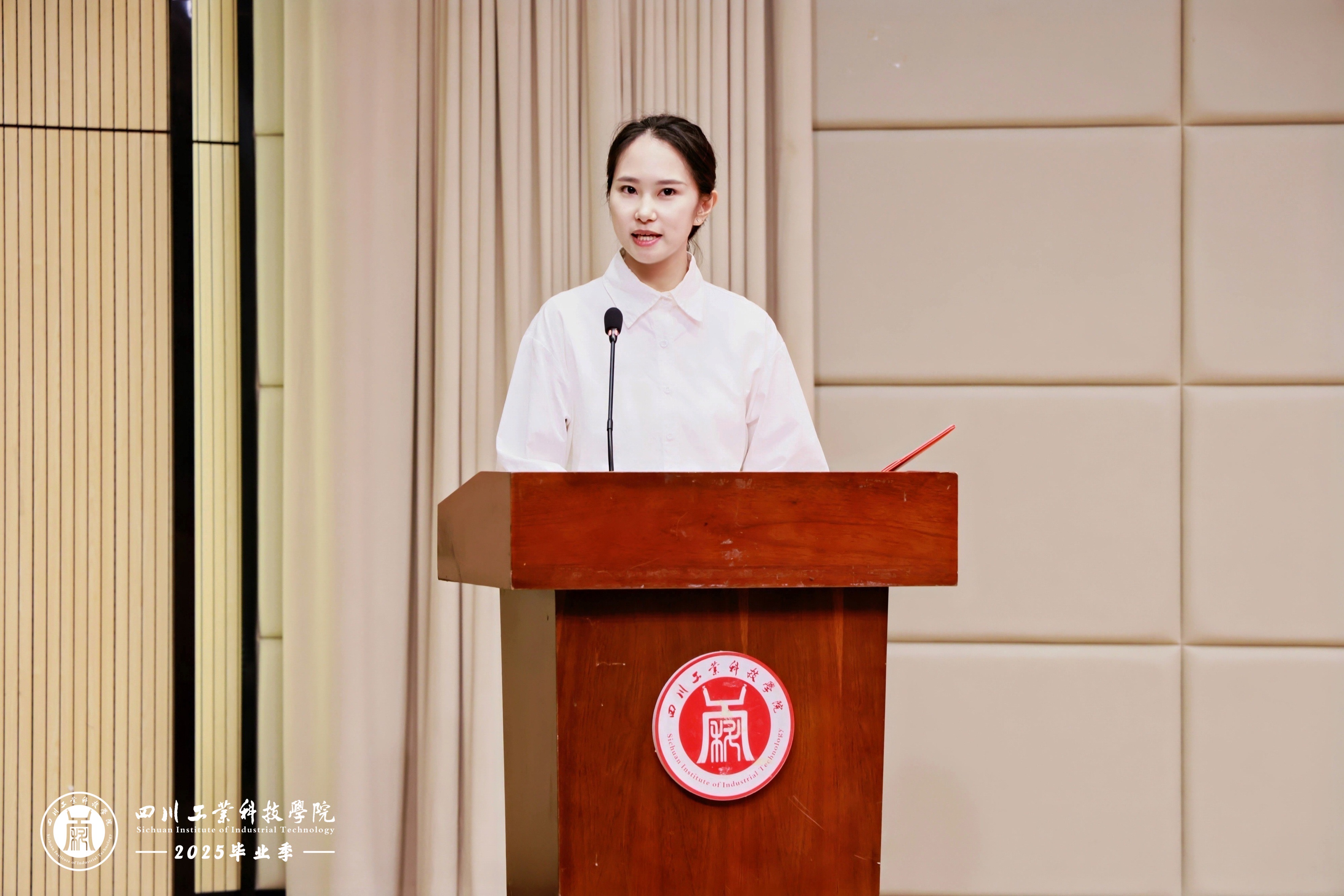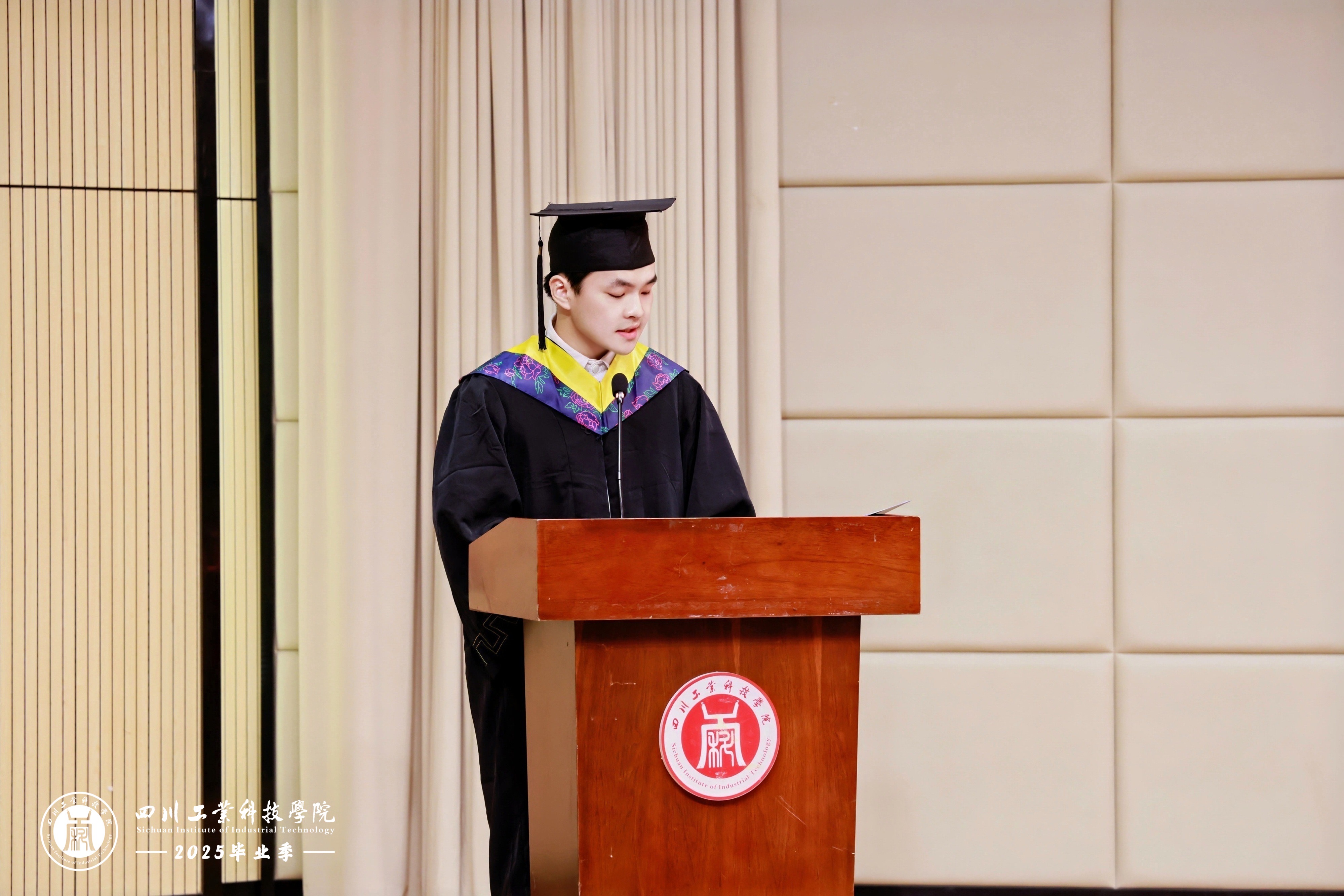 毕业生代表向乾分享了自己从军营到校园,最终考取重庆大学研究生的奋斗历程,展现了川工科学子的坚韧品格。他表示将带着母校的嘱托,在新的征程上继续奋勇前行。