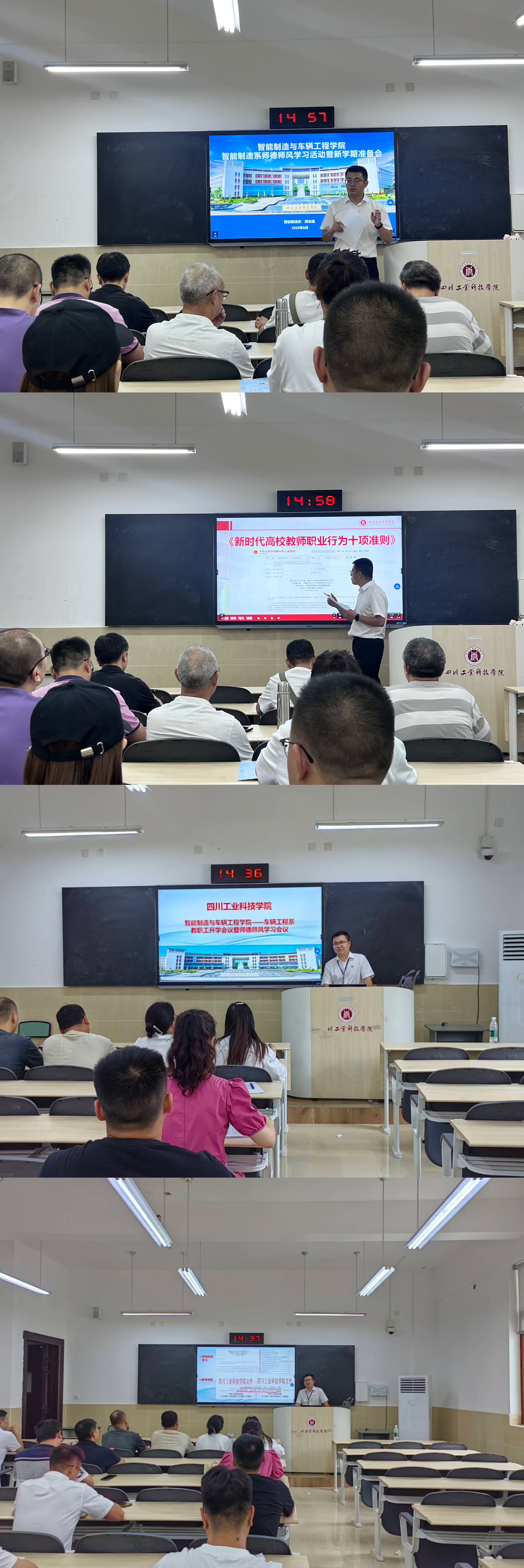 8月22日下午,学院车辆工程系、智能制造系以及实验实训管理与产教融合办公室分别组织全体教师开展了师德师风专题学习活动,重点学习了《新时代高校教师职业行为十项准则》。
