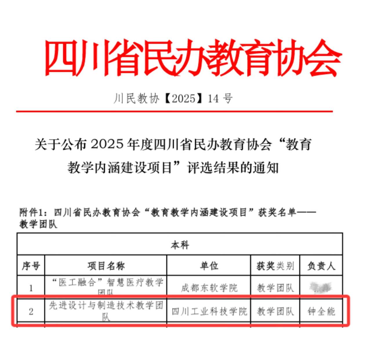 近日,四川省民办教育协会公布2025年度“教育教学内涵建设项目”评选结果。学校智能制造与车辆工程学院钟全能副教授领衔的“先进设计与制造技术教学团队”荣获省级“优秀教学团队”称号。