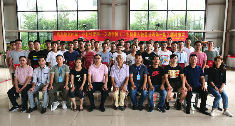 2018年8月3日,交通学院携手四川南方集创智能科技有限公司,在我院汽车营销服务实训中心举办第一期“工业机器人技能培训”结业典礼。四川南方集创智能科技有限公司副总经理刘澜锟、总工程师王志刚、交通学院副院长徐纯厚、培训中心主任马志雪及第一期33名学员参加结业典礼。