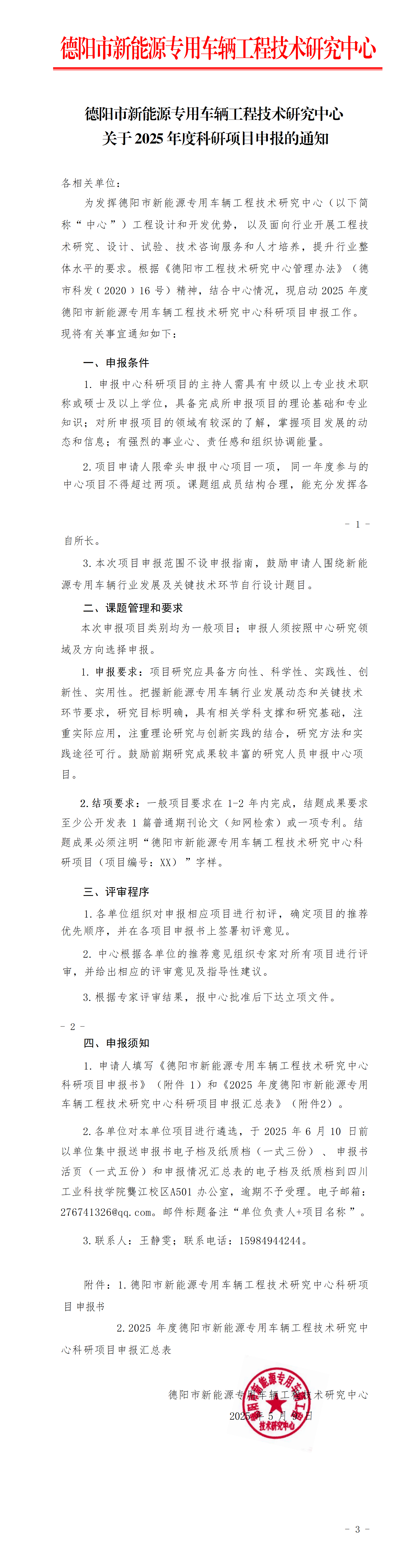 为发挥德阳市新能源专用车辆工程技术研究中心(以下简称“中心”)工程设计和开发优势, 以及面向行业开展工程技术研究、设计、试验、技术咨询服务和人才培养,提升行业整体水平的要求。根据《德阳市工程技术研究中心管理办法》(德市科发﹝2020﹞16 号)精神,结合中心情况,现启动 2025 年度 德阳市新能源专用车辆工程技术研究中心科研项目申报工作。现将有关事宜通知如下: