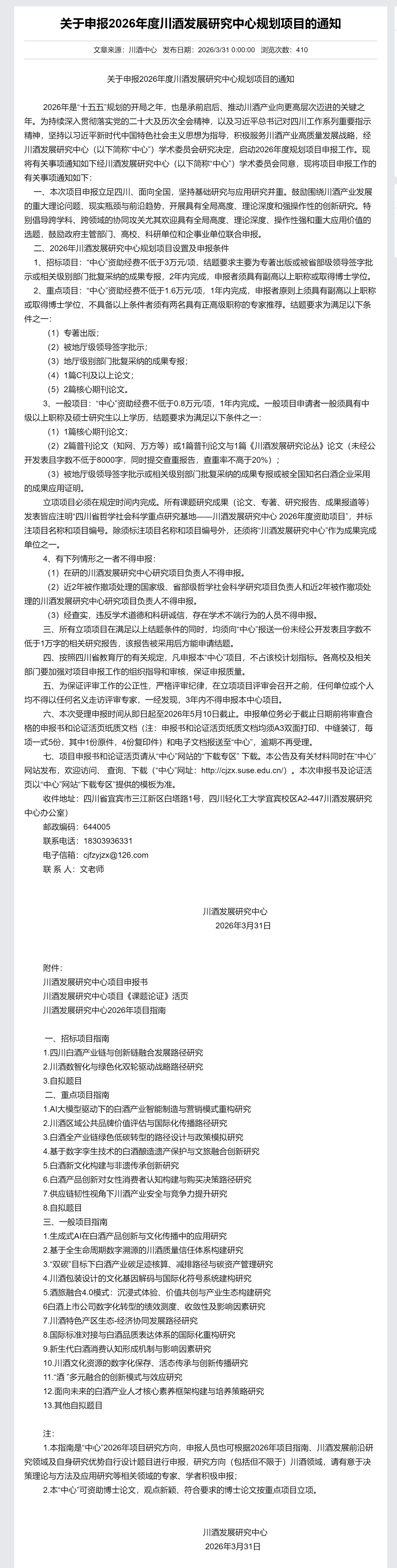 现将川酒发展研究中心2026年度规划项目申报有关事项通知如下,请有意申报的老师认真阅读通知内容,按要求准备申报材料。