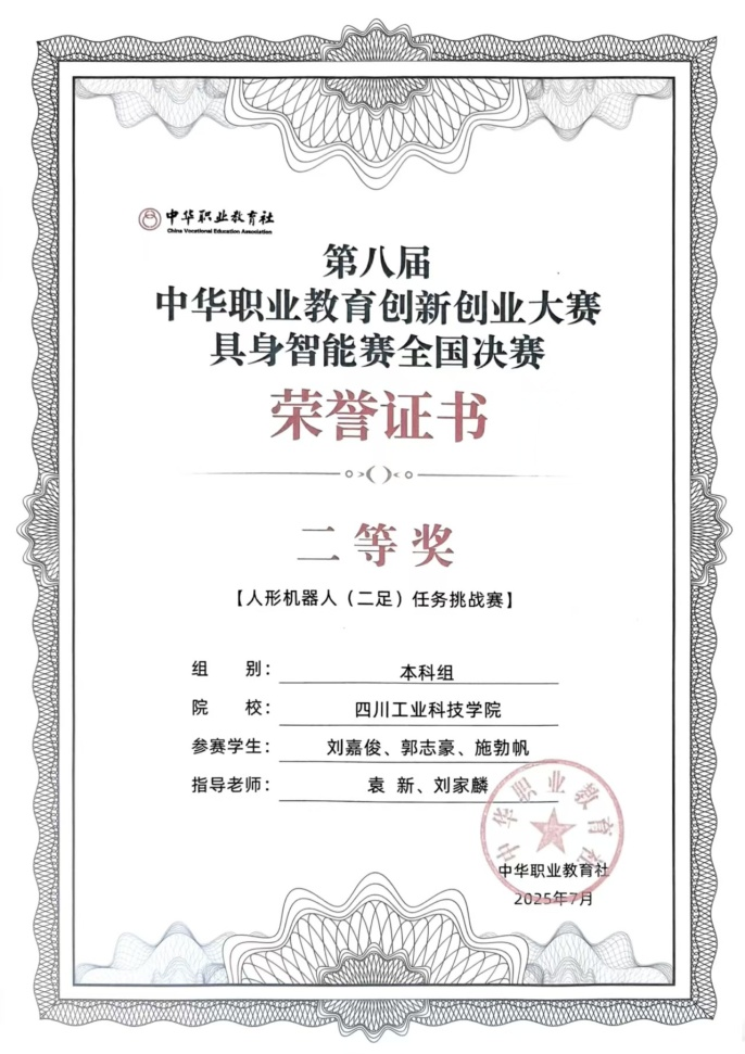 在教育部、人力资源和社会保障部指导下,由中华职业教育社主办的2025年第八届中华职业教育创新创业大赛具身智能赛全国决赛于7月10日至12日在杭州举行。本次大赛以“具身智能,创新筑梦”为主题,吸引了全国207所院校445支队伍参赛。经过激烈角逐,学校智能制造与车辆工程学院机器人创新团队在人形机器人(二足)任务挑战赛中荣获本科组全国二等奖。