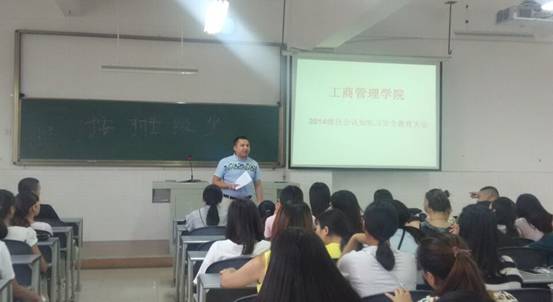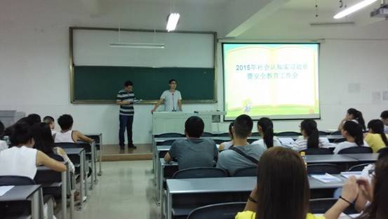 2015年08月11日,学院的全体同学在毓秀楼305、306教室召开2014级社会认知实习安全教育大会。工商管理学院副院长兼副书记王进、实习实训科孟庆旭科长、院长助理熊清明、就业干事邵长辉、学工干事施杨及各班辅导员参加了会议,会议由学工干事施杨主持。