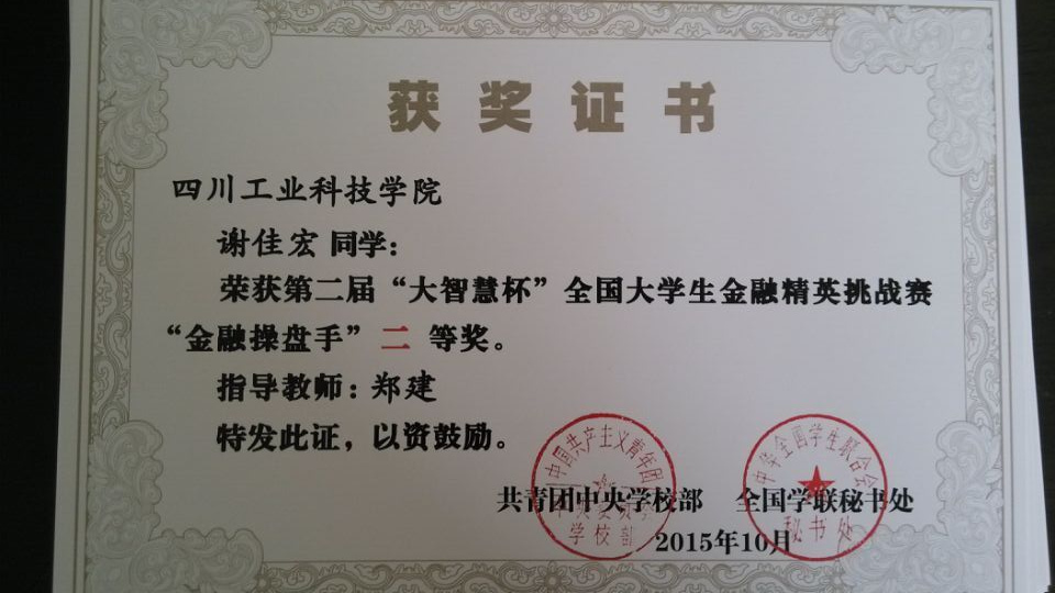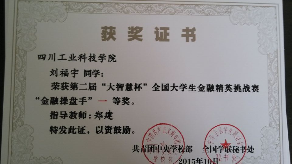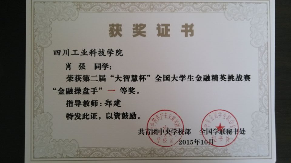 日前由共青团中央学校部、全国学联秘书处传来喜讯,在由他们主办的的第二届“大智慧杯”全国大学生金融精英挑战赛中,我院学生获得全国大学生金融操盘手一等奖二名,二等奖二名,三等奖十六名,我院郑建老师荣获“优秀领队奖”的荣誉。这是我院金融专业实践性教学的重大成果,也是我院构建产学结合实践教学体系过程中又一成功尝试。