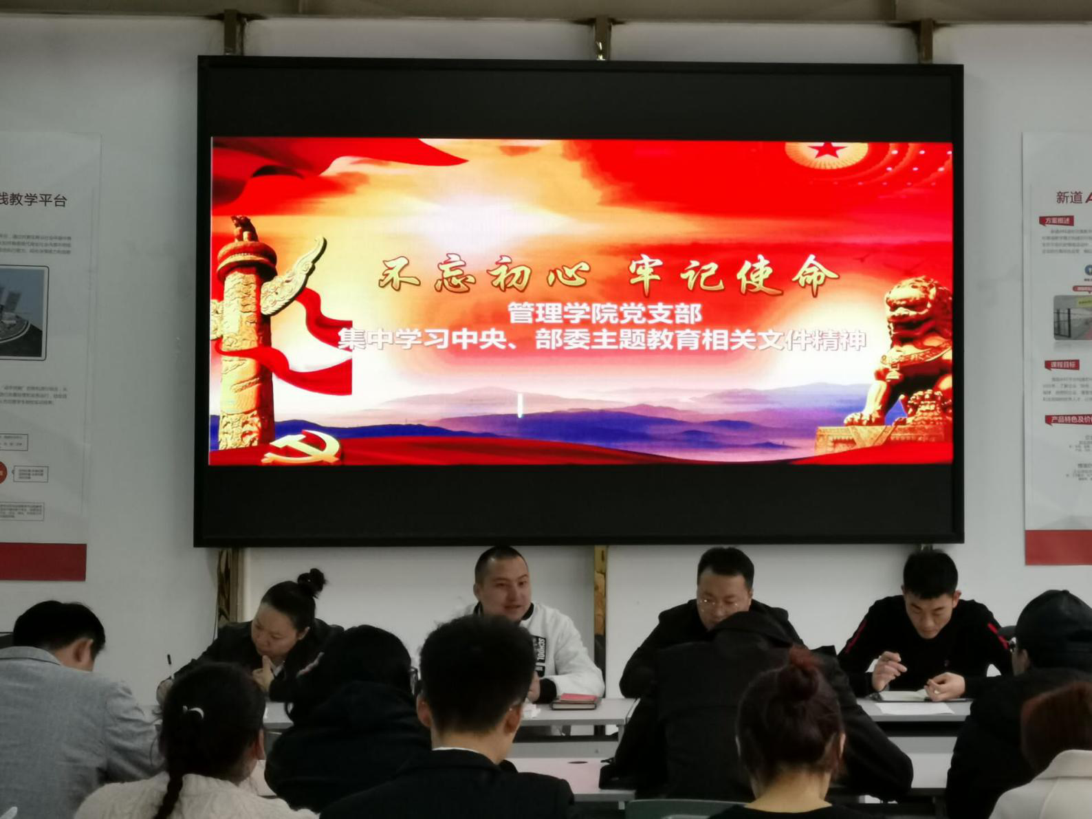 10月27日,管理学院党支部于ARE实训室举行“不忘初心,牢记使命” 中央、部委主题教育相关文件和讲话精神,参会的有党支部书记王进、组织委员施杨、纪检委员王波、宣传委员张东国及全体党员师生。会议由王进主持。