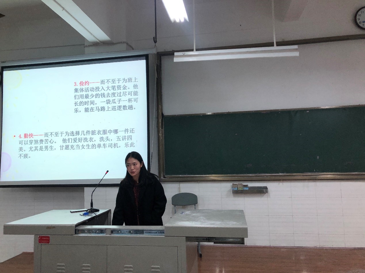 12月15日晚,18级财管5班以“真确树立三观”为主题的班会在毓秀楼301教室开展,参加此次主题班会的有辅导员刘羚,以及18级财管4、5、6班、金融1班全体同学。
