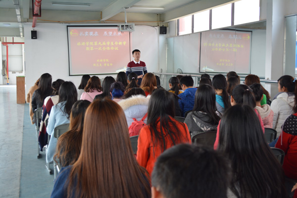 3月2日中午,旅游学院第九届团总支学生分会新学期第一次全体会议在航空实训室召开。会议由团总支书记李双晶主持,学院党支部副书记何林贵出席会议,学生会干部全体参加。