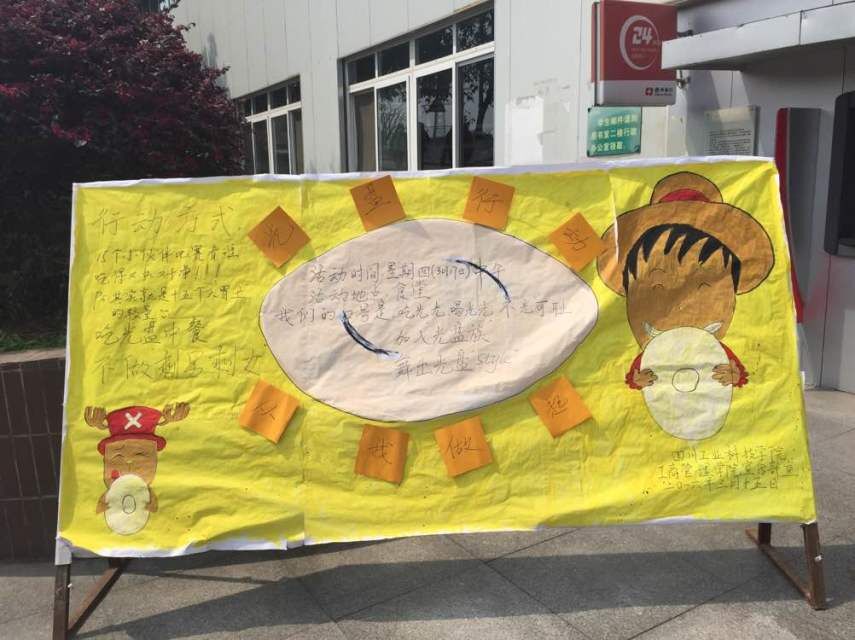 为了响应学校“节约粮食,文明餐桌”的号召。从3月7日开始我院团总支学生分会学生干部们先进行了为期一周的主题宣传,2016年3月17日,在校园鼎亨食堂举行了“拒绝剩宴,光盘行动”为活动。来自我院各个专业的十五名选手参与了此次光盘行动。
