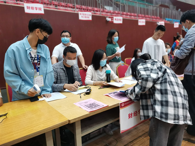 新生陆续来报道,志愿者们迅速帮助他们把行李寄存好,有条不紊的引领新生完成报到的所有程序,报到过程虽然简单,但其中不乏有语言差异等问题,在系领导和老师的细心讲解下,真正做到了:沟通零距离,沟通无差异。