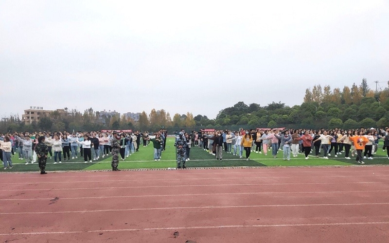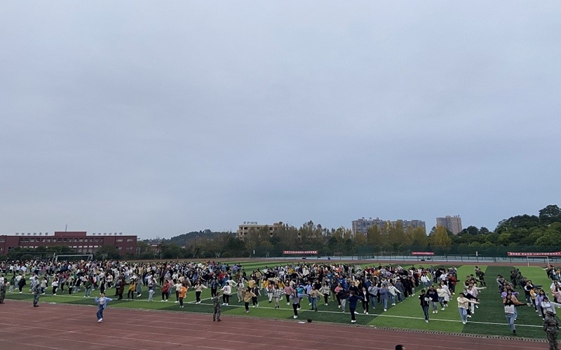 7点20,2020级新生在教官队的带领下围绕操场跑道进行跑步运动,同学们迈着坚实的步伐,喊着响亮的口号开始晨跑。晨跑结束后,教官整理队形,随后在文艺委员带领下,同学们跟着音乐的节奏,开始跳健身操。
