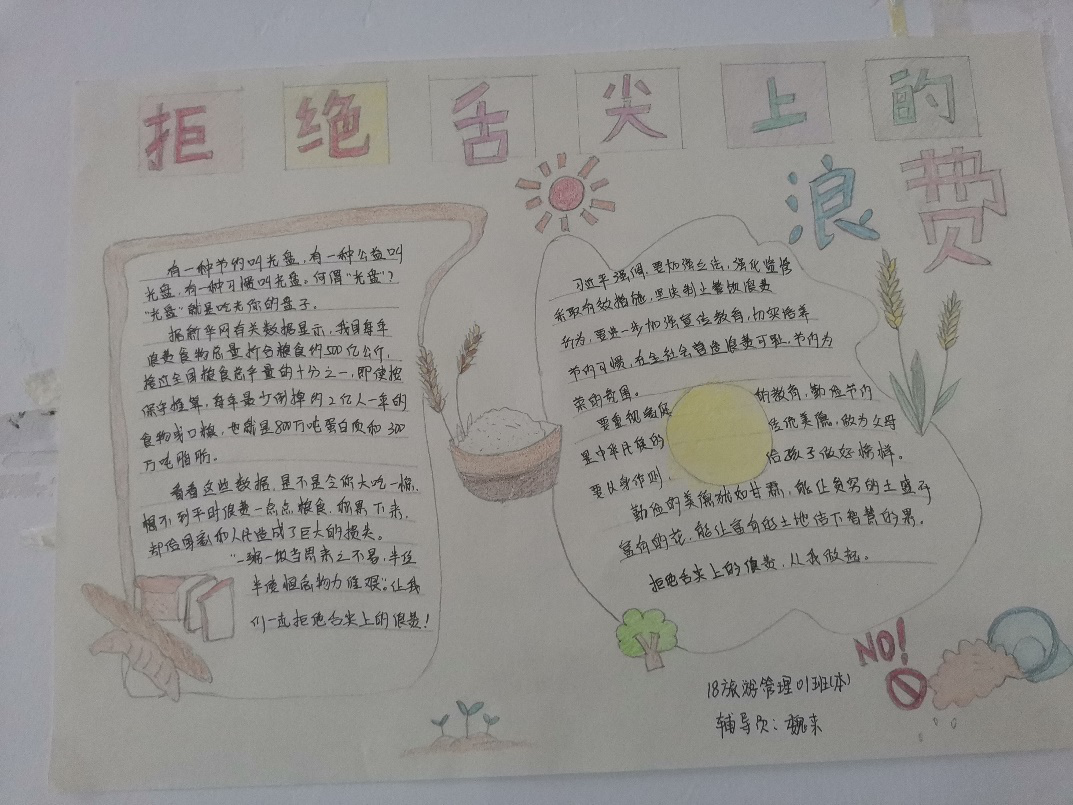 为营造宣传氛围,各班灵活开展宣传板报制作、主题班会教育活动。各班通过新闻视频、PPT文案讲解等形式,从国家层面、个人层面详细解读了习总书记提出的“厉行节俭,反对浪费”倡议的社会背景和现实意义。并通过问卷形式让同学们反思自己生活中的浪费行为。主题班会上同学们进行了积极地讨论,大家积极发言,并且进行了自我反思,会后大家在吃饭的时候也会格外珍惜每一粒饭,做到了真正的“光盘”,并且深切体会到在食堂中贴的标语的含义,大家都积极做“光盘行动”的践行者。