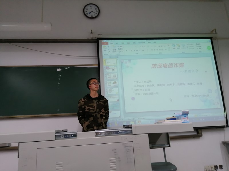 11月8日,20级财务管理1班在辅导员伍清老师的组织下于钟灵楼203教室召开以“防电信网络诈骗”为主题的班会,此次班会由樊芸扬同学进行主讲,并且由陶金凤、胡利琼、段华宇、谢博文、陈珊同学进行资料的收集准备。
