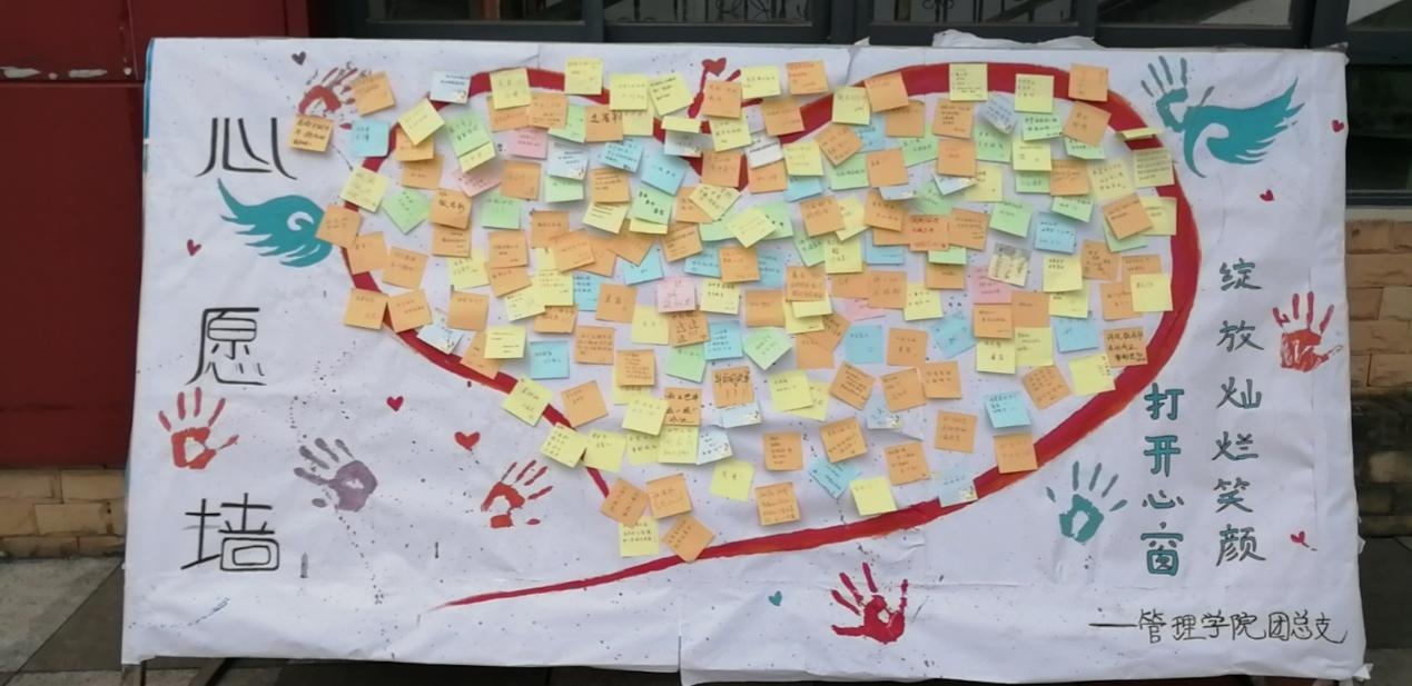 心里健康人人应行,心愿墙上事事如意。5月25日,正值全国大学生心理健康日,为引导学生在疫情期间关心关爱自己,缓解心理压力,增进人际交往,管理学院于航空实训室门口开展心愿墙活动,吸引各年级同学积极参与。