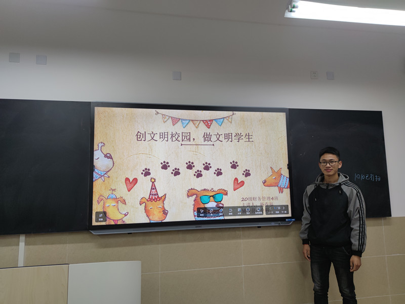 为深入学习宣传贯彻党的方针政策,培养学生良好的文明行为习惯和优秀的道德品质,树立文明新形象。2021年10月10日晚,20级财务管理四班在D204开展了以“创文明校园,做文明学生”和“网络安全为人民,网络安全靠人民”为主题的班会活动。班会由管洪萍和杨春福共同主持,辅导员仝科参加了本次班会。