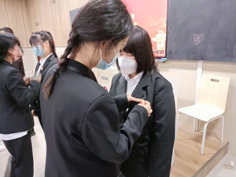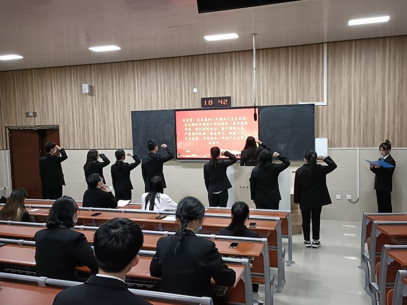 仪式伊始,全体人员齐唱国歌,深深激发了同学们光荣入团的集体荣誉感和使命感。接着,张照明老师宣读团员候选人名单。随后十位候选人就自身情况进行汇报,各班团支部书进行无记名投票表决。在整理汇总投票后,秦德红老师宣读最终入团名单并做出总结,希望各班团支书积极号召各班同学观看青年大学习。最后,老团员为新团员佩戴团徽,新团员宣誓庄严的誓词。