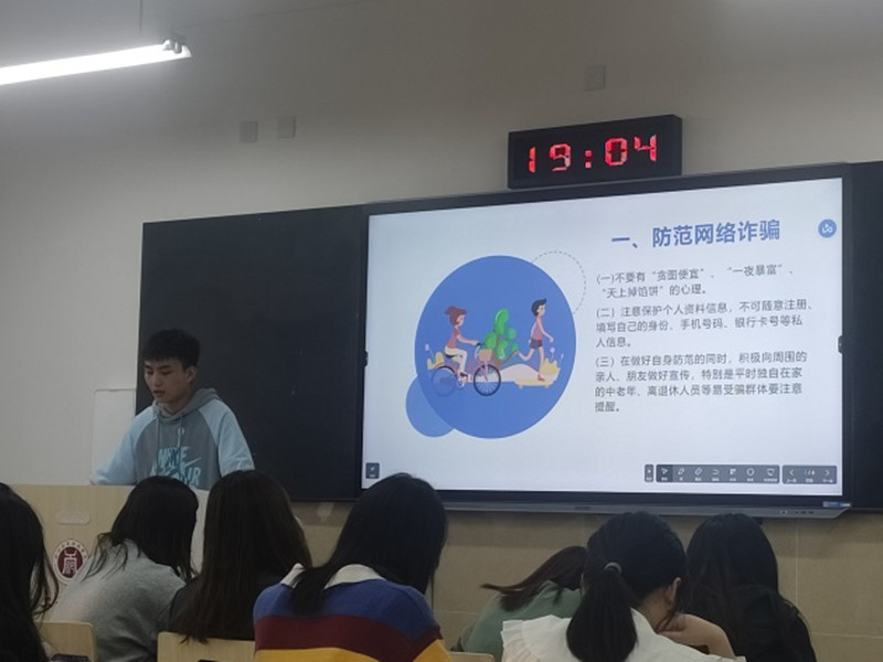 为了提高同学们的诈骗防范意识,增强自我保护能力,进一步维护同学们自身的合法权益。5月1日晚7点,管理学院各班全体同学于龑江教学楼开展了“防范电信网络诈骗,共建无诈校园”主题班会,本次班会由各班辅导员老师主持召开,班级全体同学按时参加。