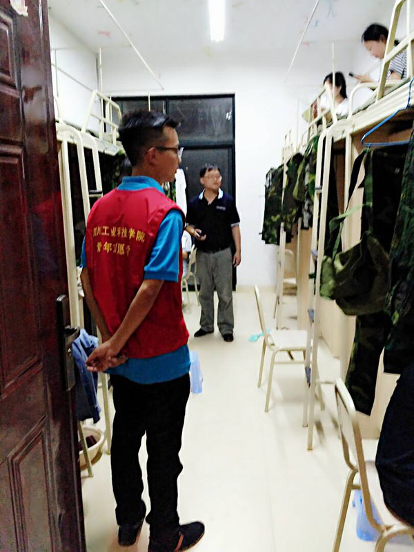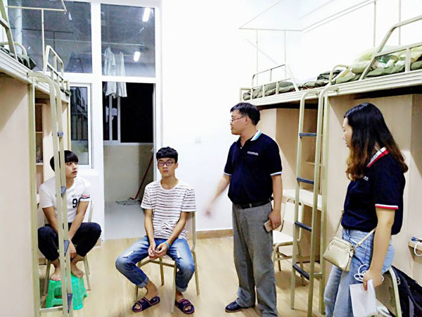 (何林贵书记和李双晶老师到娇子8栋学生寝室了解新生的入学情况)