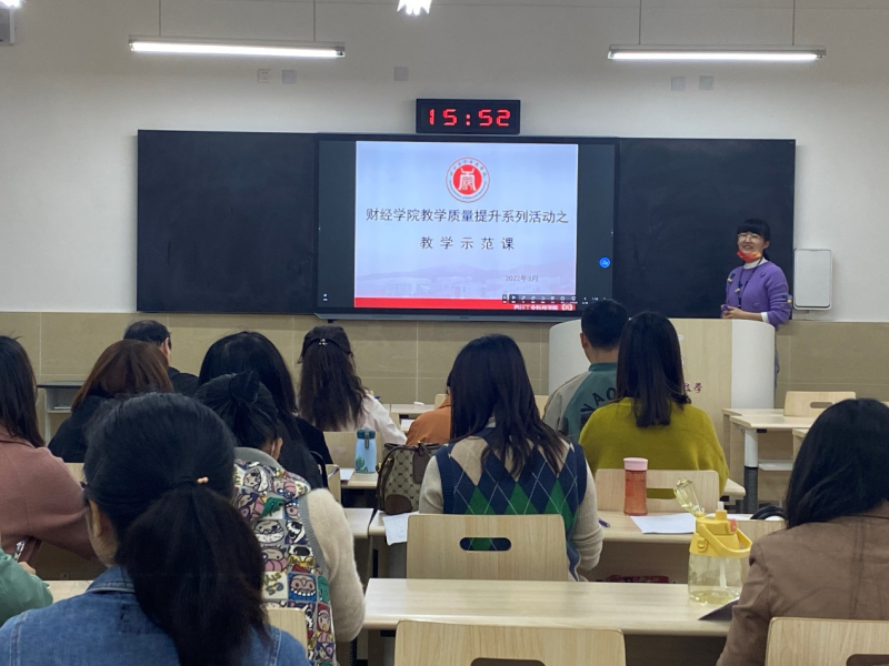 3月24日下午,财经学院全体教师齐聚B411教室开展了教学质量提升系列活动,活动中赵小英和胡悦两位年轻教师为全体财经学院老师带来了两节精彩的示范课程。