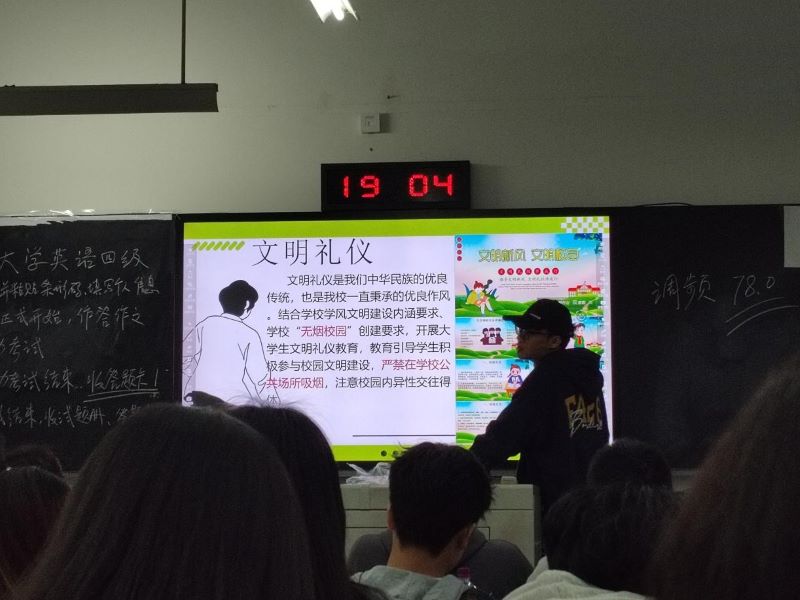老师通过案例分析、PPT演讲、知识问答等形式加强了大学生的整体素质。班会中老师提到文明礼仪是中华民族的优良传统,也是我校一直秉承的优良作风。结合学校学风文明建设内涵要求、学校“无烟校园”创建要求,开展大学生文明礼仪教育,教育引导学生积极参与校园文明建设,严禁在学校公共场所吸烟,注意校园内异性交往得体,尊敬老师,关爱同学,团结友爱。同时也进行了交通安全教育,提高大学生的自防自护能力。