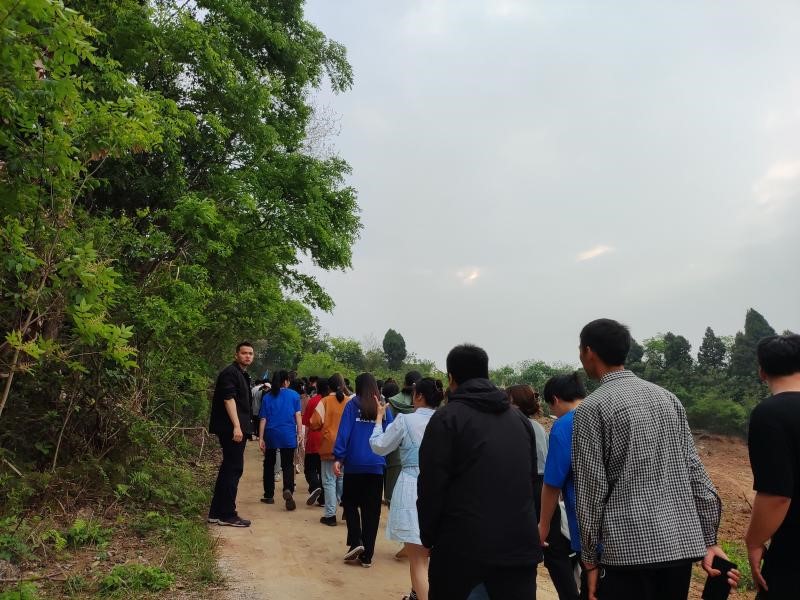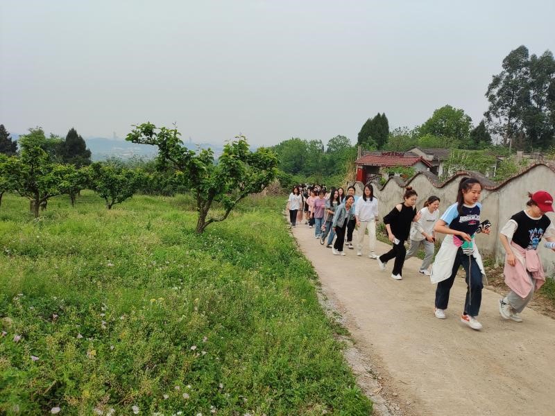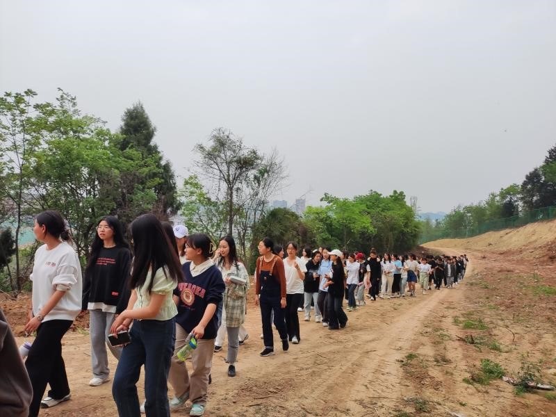 活动开始,班级之间保持间隔,由班长(佩戴学生会袖章)在班级前列带队,辅导员在班级后侧压队。学院学生组成的队伍沿着泥地行走,两人成行,有序前进。穿过绿草如茵的草地,洋溢着欢声笑语,充满夏日生机。