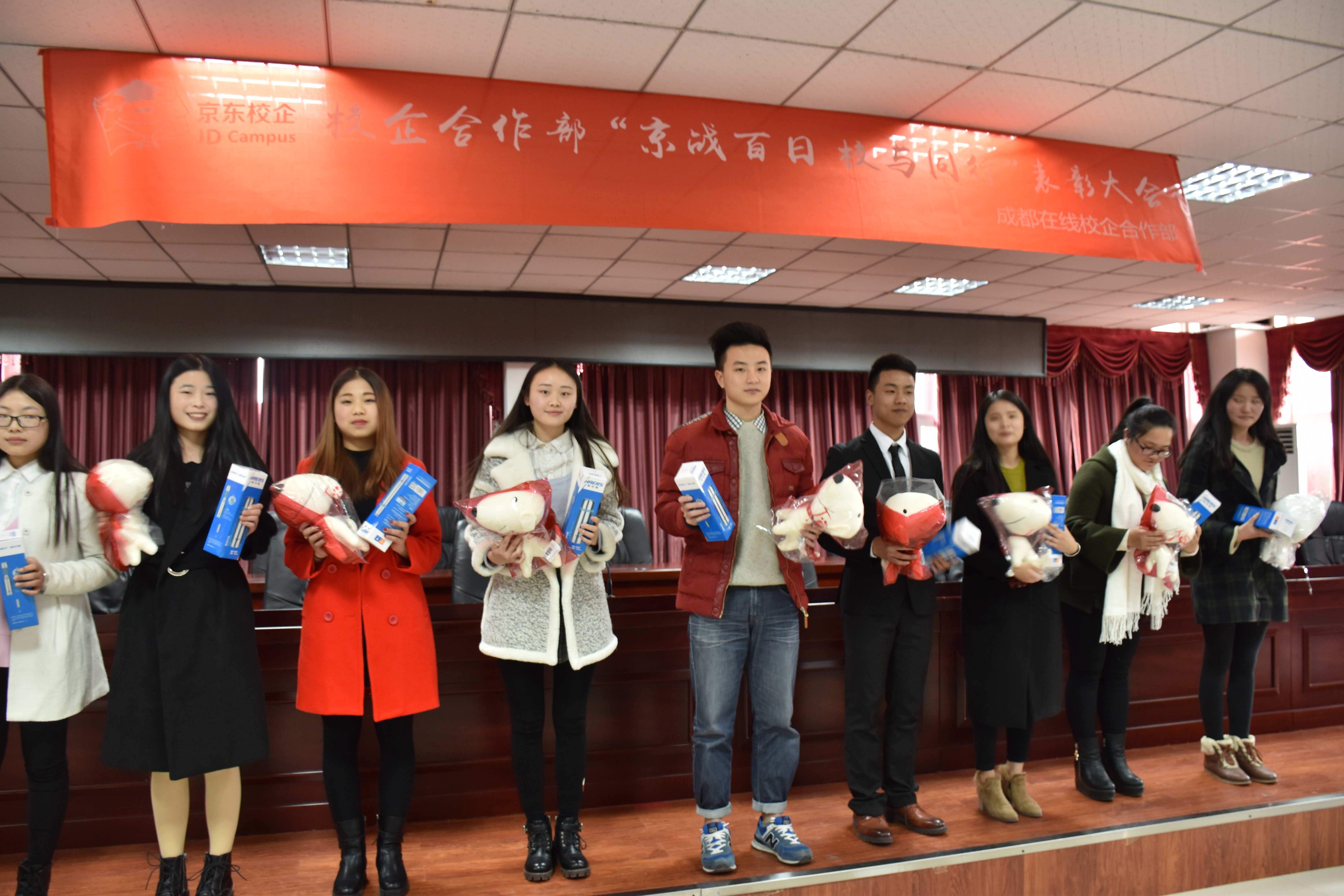 依据本科培养计划,2016年10月17日—12月16日我院2014级物流管理专业137名本科生在我校与京东商城共建的实训室开展了为期8周的京东课程实训。为总结本次实训中的问题,表彰在实训期间表现优异的学生,12月22日下午14:30,在D408会议室召开了京东课程实训表彰大会。江苏京东信息技术有限公司成都分公司高级经理单鑫鑫、成都分公司驻场经理陈谨瑞及驻场主管一行4人代表企业参加了大会;工商管理学院副院长王进、副书记邵长辉及班级辅导员参加了大会。大会由张涣显同学主持。