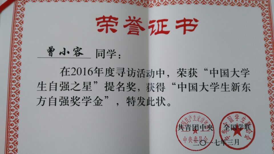 近日,由共青团中央、全国学联主办,中国青年报社、中国高校传媒联盟承办的2016年度寻访“中国大学生自强之星”活动结果揭晓,我校工商管理学院2014级物流管理本科1班曾小容同学荣获“中国大学生自强之星”提名奖,该奖项四川省大学生仅有两人获奖。