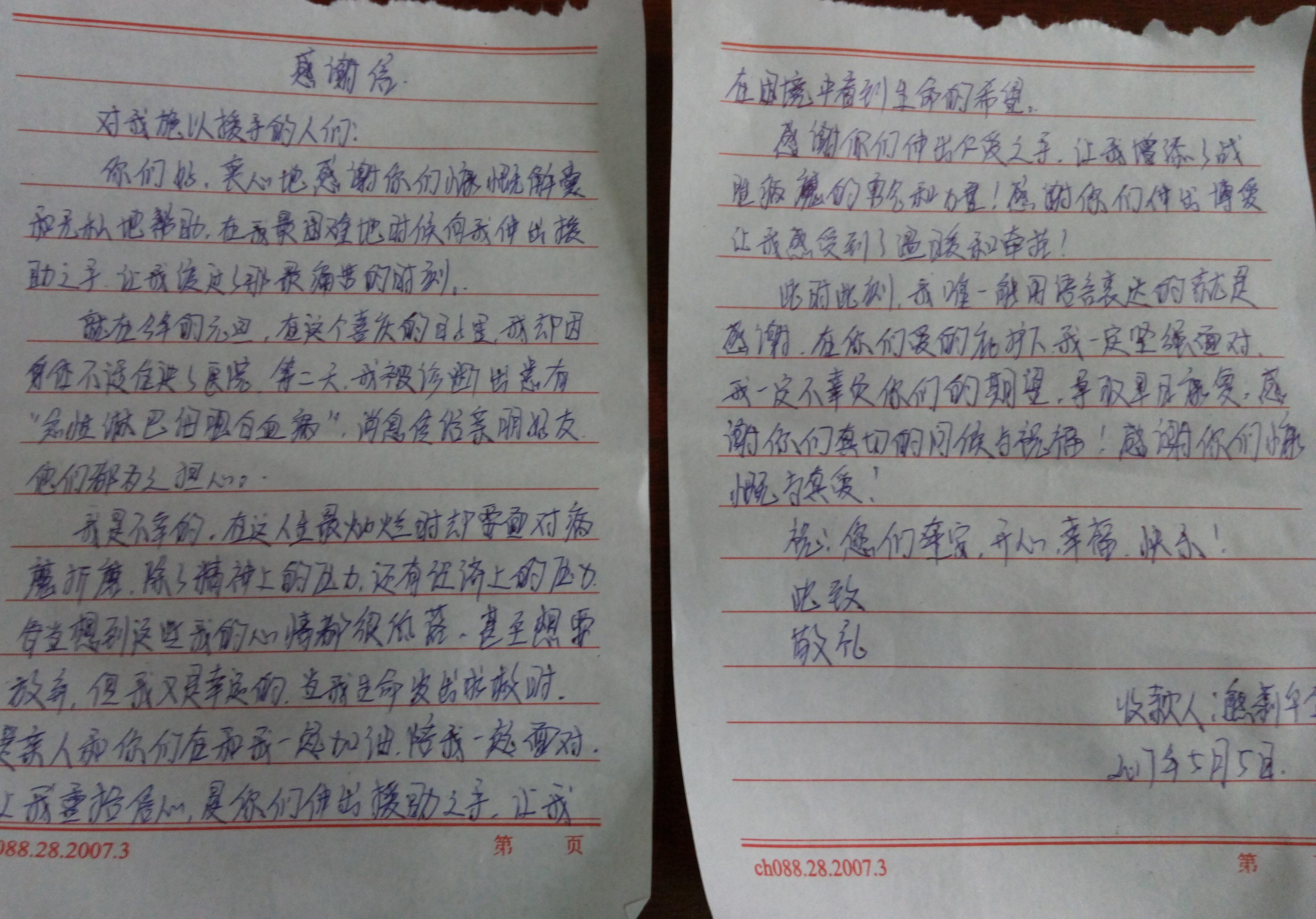 5月5日上午,学院党支部副书记邵长辉、校学生处综合科科长根秋拉姆、院学工办副主任施杨、学生代表,一行4人,到德阳市人民医院看望了熊莉华同学,并将善款交到她亲人手中。邵长辉、根秋拉姆鼓励她要有战胜疾病的信心和力量,安心治病,争取早日康复。其家人对所有关心和捐助的师生表示衷心的感谢,熊莉华更亲笔写下感谢信,向帮助她与病魔斗争的全校师生表示诚挚的感谢。