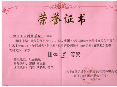 本次大赛通过模拟企业税务工作,将参赛选手分为开票员、税务会计和财务主管为组的团队形式参赛;旨在促进税务专业文化建设、普及税务专业知识、营造专业技能氛围、提高学生动手操作能力。我校财经学院税务专业学生刘欢、李晓凤、蒲英以团队形式参加了本次比赛,并荣获团体三等奖。期待我院财会专业同学在今后的各类赛事中能够再接再厉,取得更为优秀的成绩!