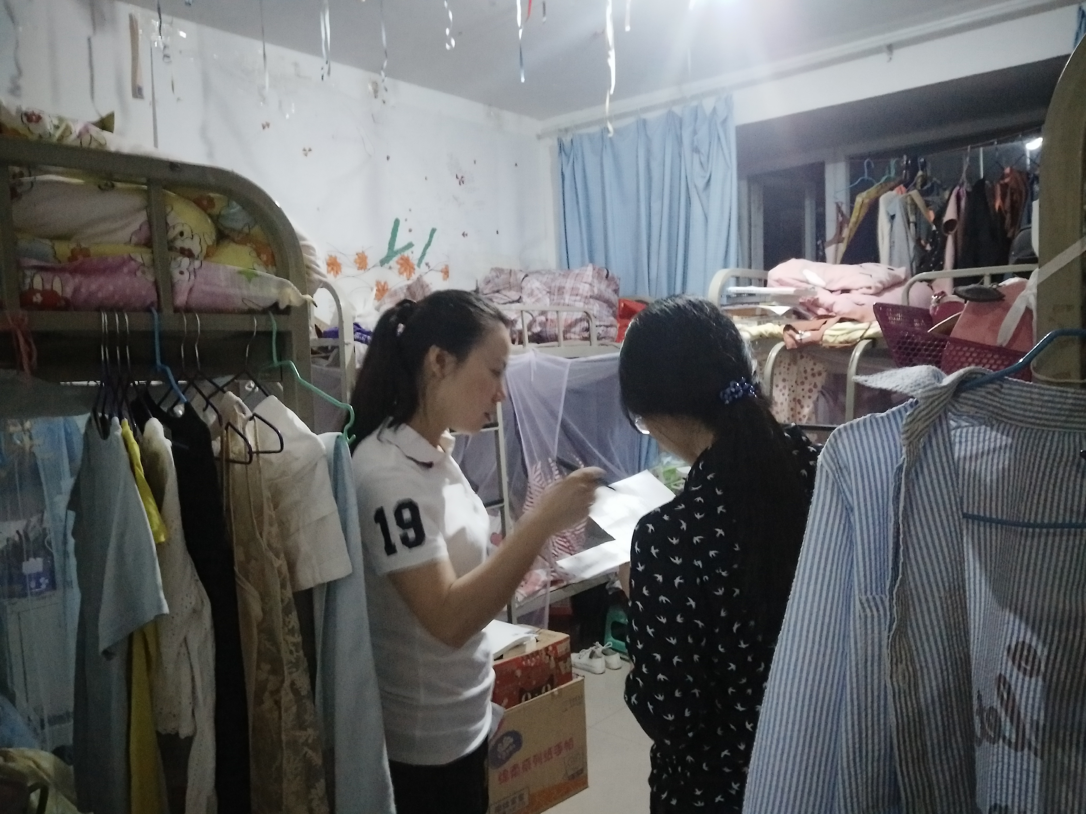 本次主要检查寝室的安全用电、宿舍文化、学生晚归、未归等情况。检查发现,大部分学生宿舍能够保持干净整洁的室内环境,都能及时在规定时间内会寝室就寝,但仍存在被物品摆放杂乱、通风状况较差等问题;有的同学未将贵重物品妥善保管,笔记本电脑、手机、钱包随意放置。现场检查人员对发现的问题做了详细的记录。