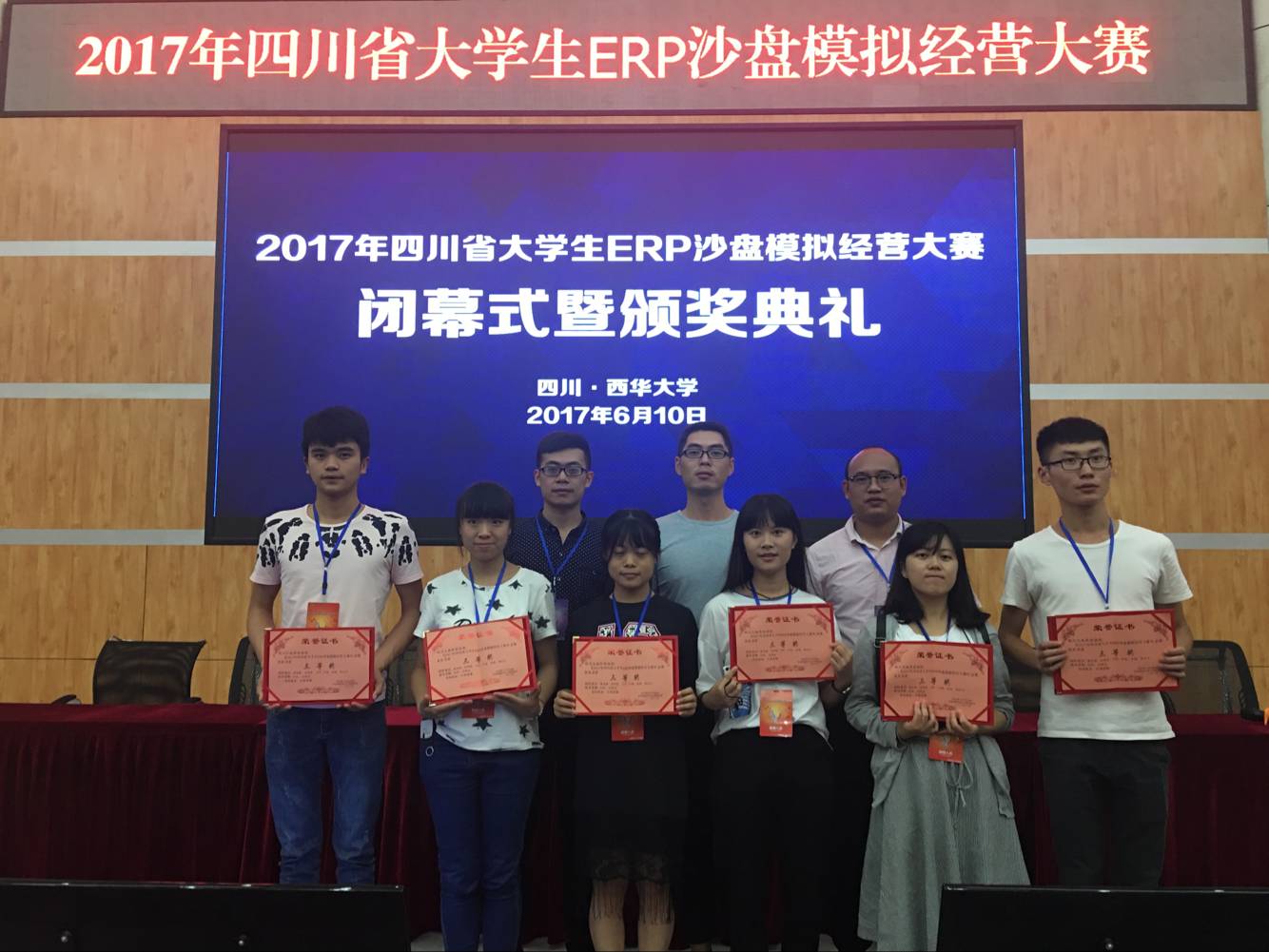 2017年6月9日-10日由四川省教育厅主办的2017年四川省大学生ERP沙盘模拟经营大赛在西华大学展开,本次大赛共有来自全省33所本科高校的代表队参加。我校工商管理学院2015级物流管理专业(本科)辜巡峰、张婷雯、马芳、张铭、陈志兴、叶艳6位同学在熊清明、何林、伍晓龙老师的指导下荣获团体三等奖。