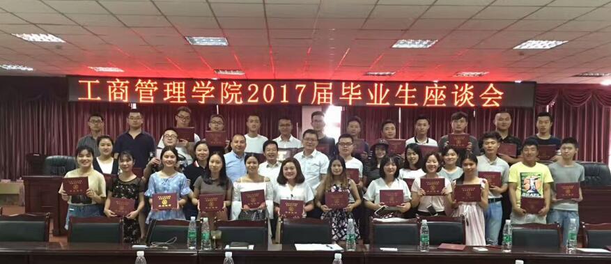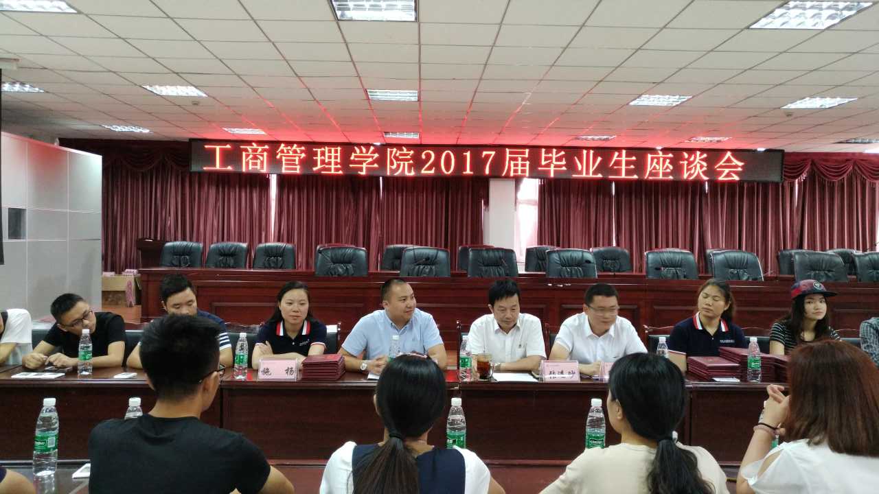 2017年7月8日上午10:30,工商管理学院2017届毕业生座谈会在校图书馆D08会议室举行。学校党委副书记张进砂、工商管理学院副院长王进、副书记邵长辉、学工办副主任施杨等老师及我院40余名毕业生代表参加了本次座谈会,会议由邵长辉主持。