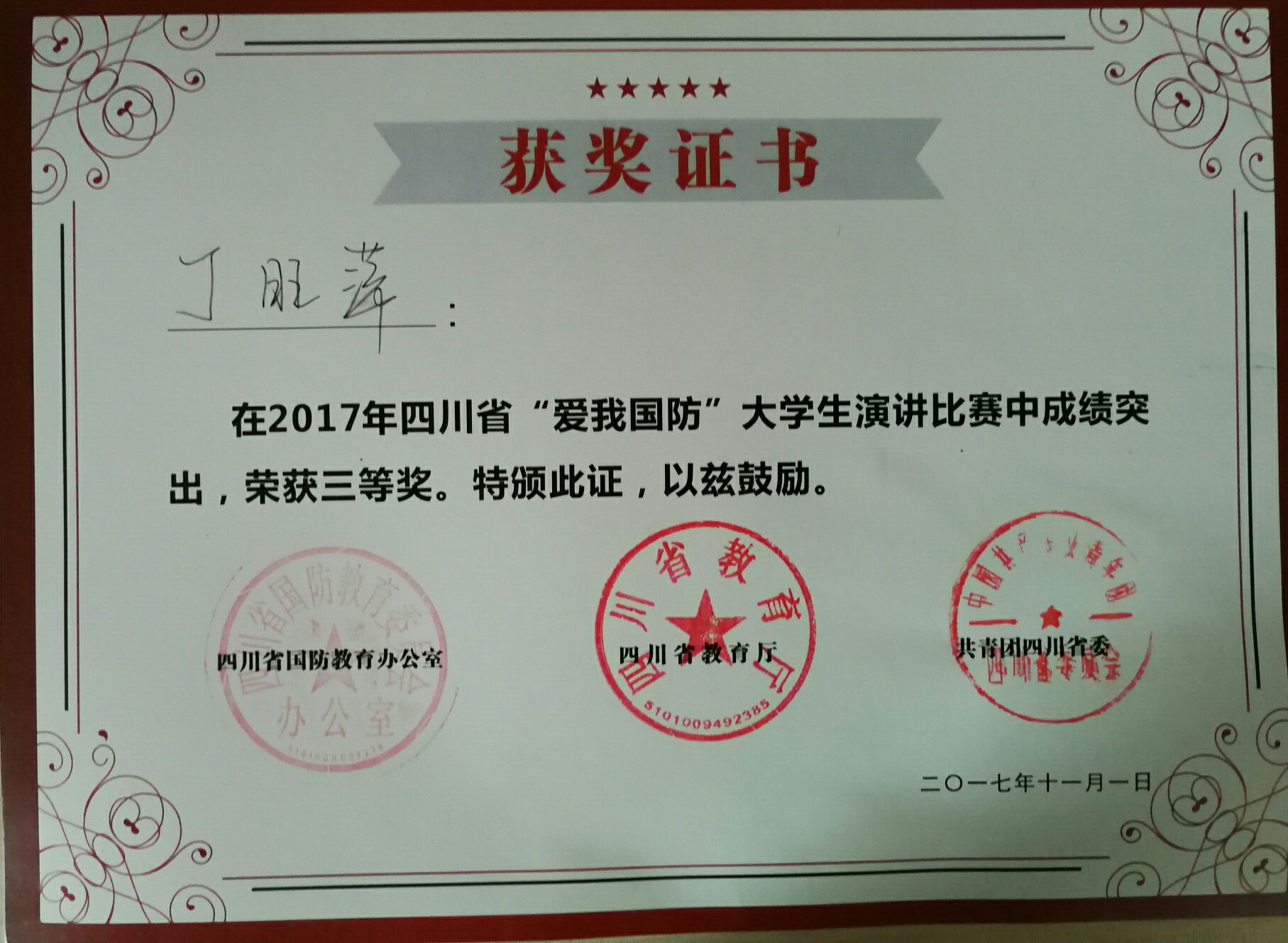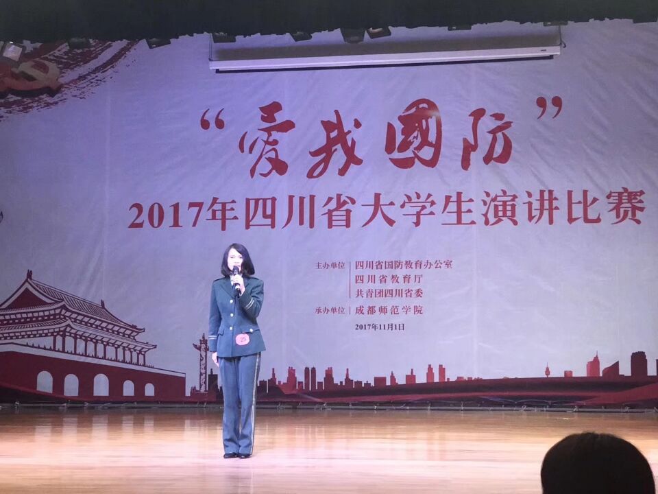 11月1日,我院丁旺萍同学代表我校参加2017年“爱我国防”全国大学生演讲比赛四川赛区决赛,与来自电子科技大学、成都理工大学、西南石油大学、四川师范大学、西南科技大学等省内27所高校选手在成都师范大学同台竞技,最终斩获四川赛区三等奖。