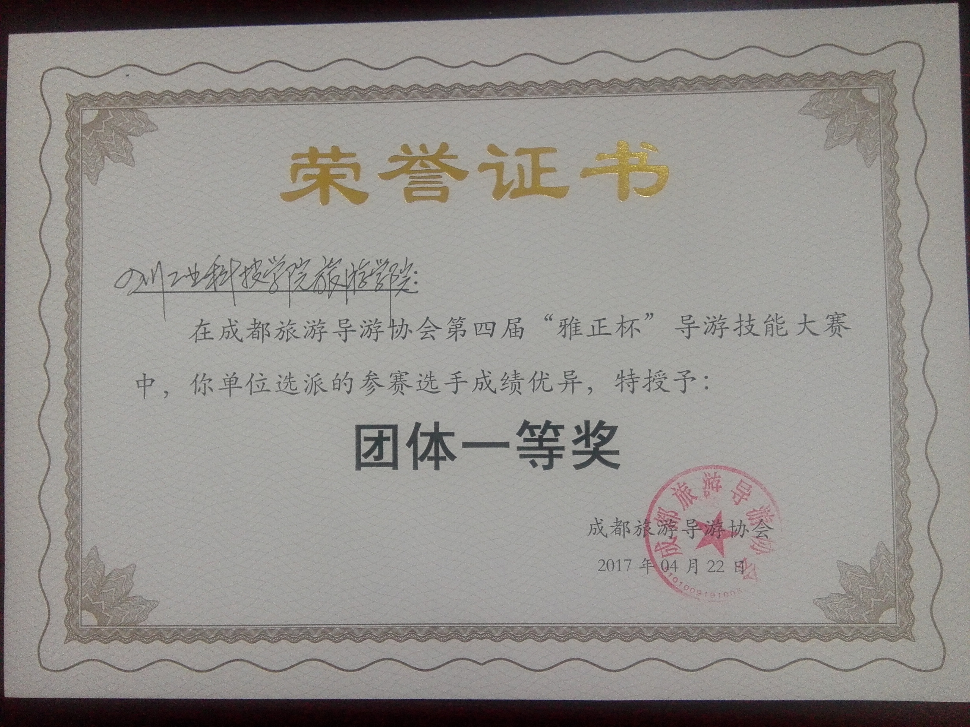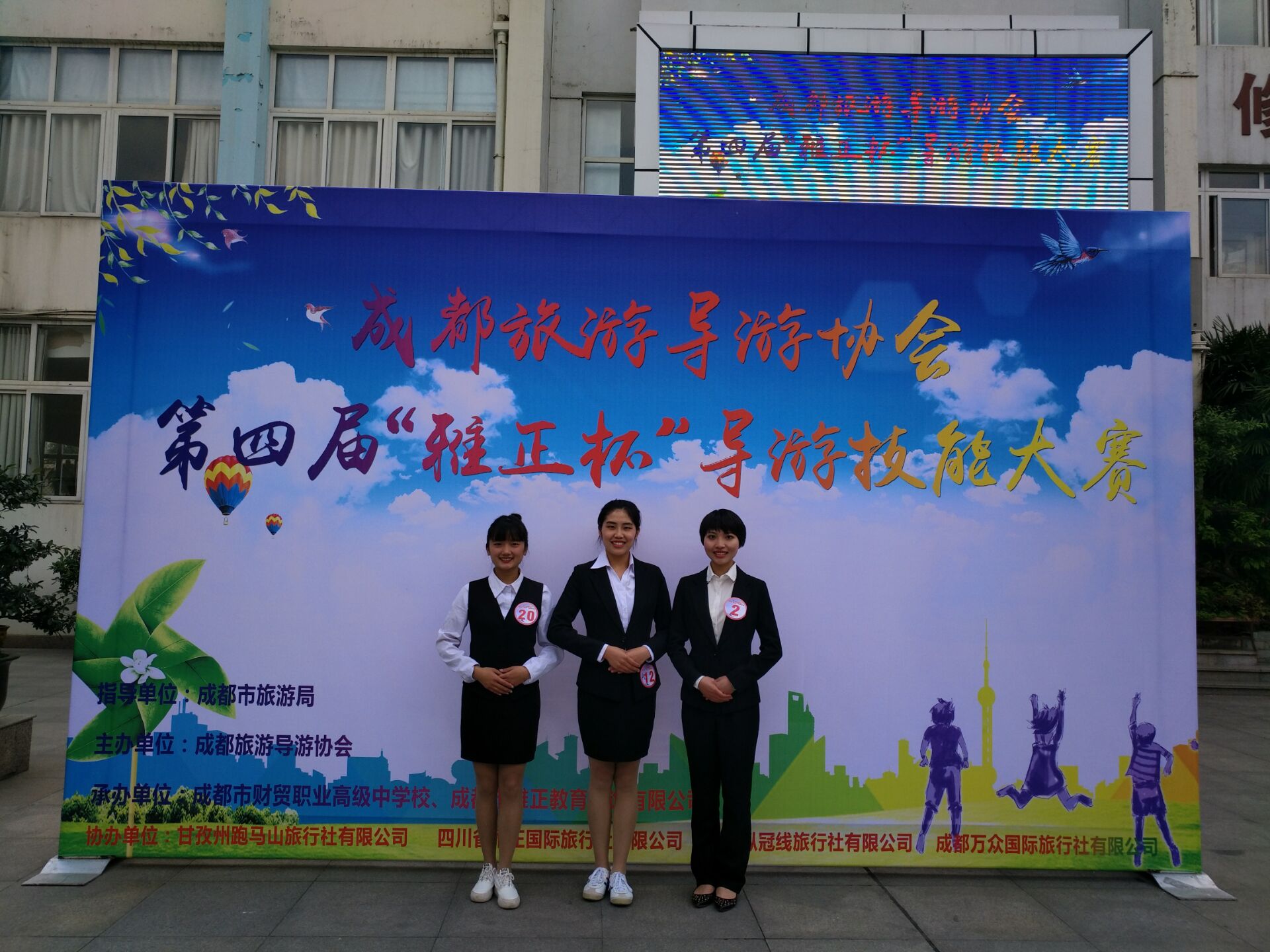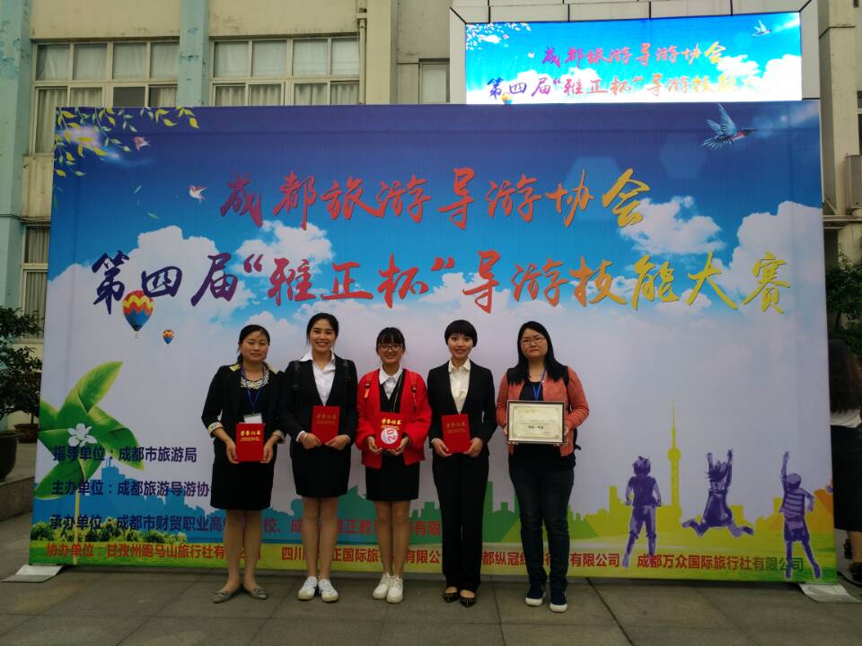 2017年4月22日由成都旅游导游协会主办的第四届“雅正杯”导游技能大赛在四川财贸职业高中隆重举行。我院通过层层选拔,最终选派3名选手在旅游管理教研室主任温兴燕老师的带领下参加了此次比赛。大赛分为普通话讲解(乔潇蝶、曹慧-中文组)与英语讲解(黄荣-英文组)两个系列。
