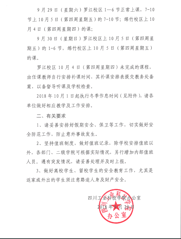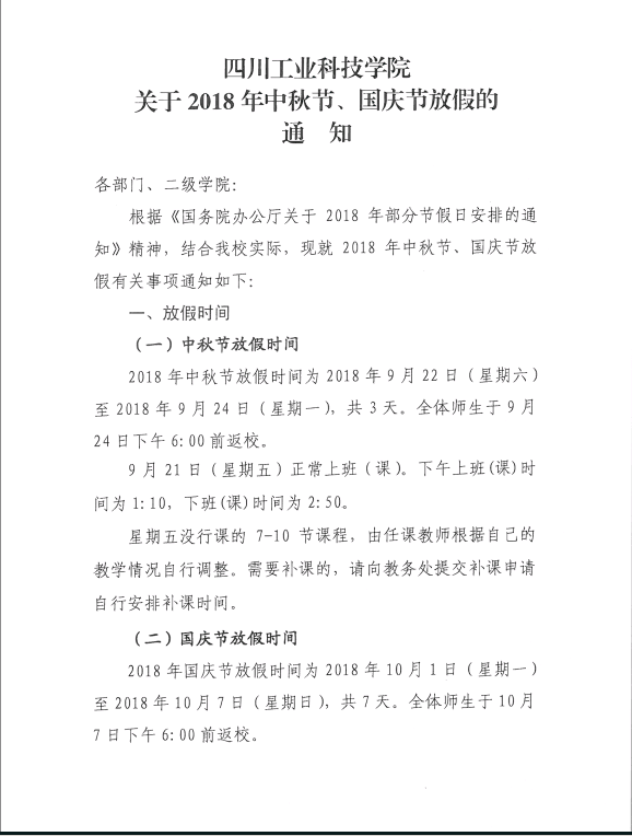 四川工业科技学院关于2018年中秋、国庆节放假的通知