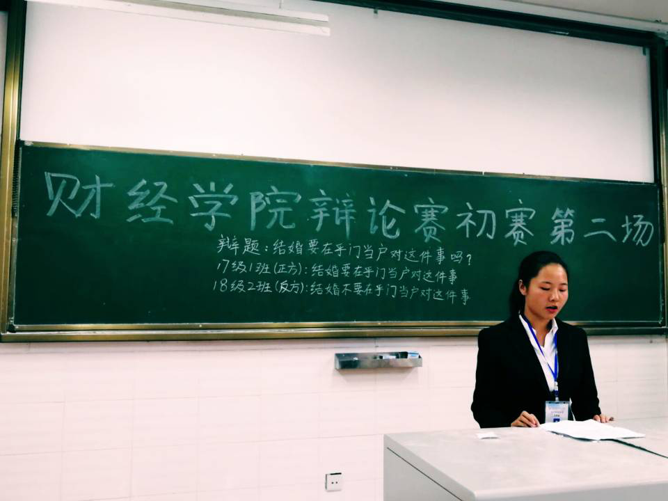 10月11日中午,由财经学院主办的辩论赛初赛第二场在毓秀103举办。本次比赛由陈晓兰主持,参加本次比赛的评委有办公室部长赵丽洁,纪检部部长王凤娇,办公室副部长黄家伟,纪检部副部长唐洪娟,以及来自17级1班、18级2班的辩手和参赛班级的部分同学。