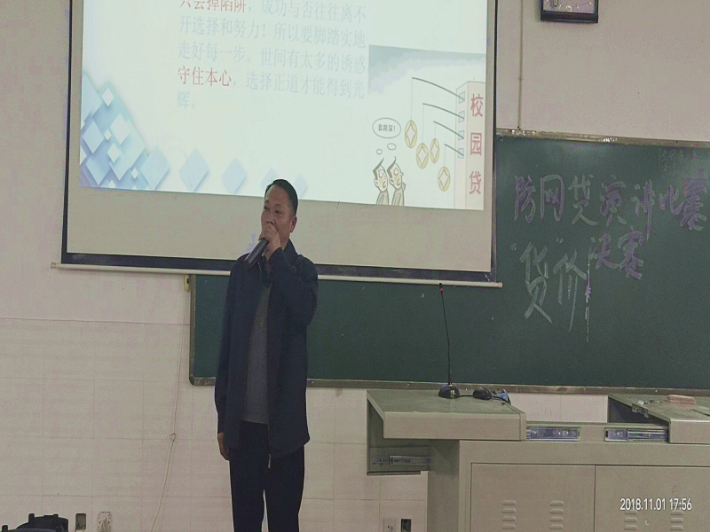 11月1日下午于我校毓秀104开展了由团总支学生会体育部承办的防网贷演讲比赛决赛。参赛人员是12位分别来自财经学院各班的同学们,观赛领导有学工部部长、学生处处长邓成奉;学生处副书记彭久军;团委副书记王成鑫;财经学院党支部副书记杨永岗以及财经学院团总支书记仝科。