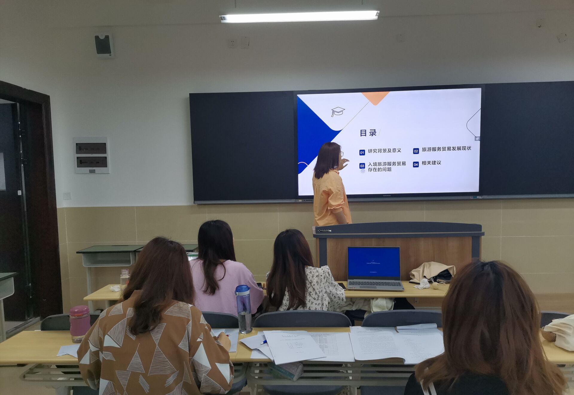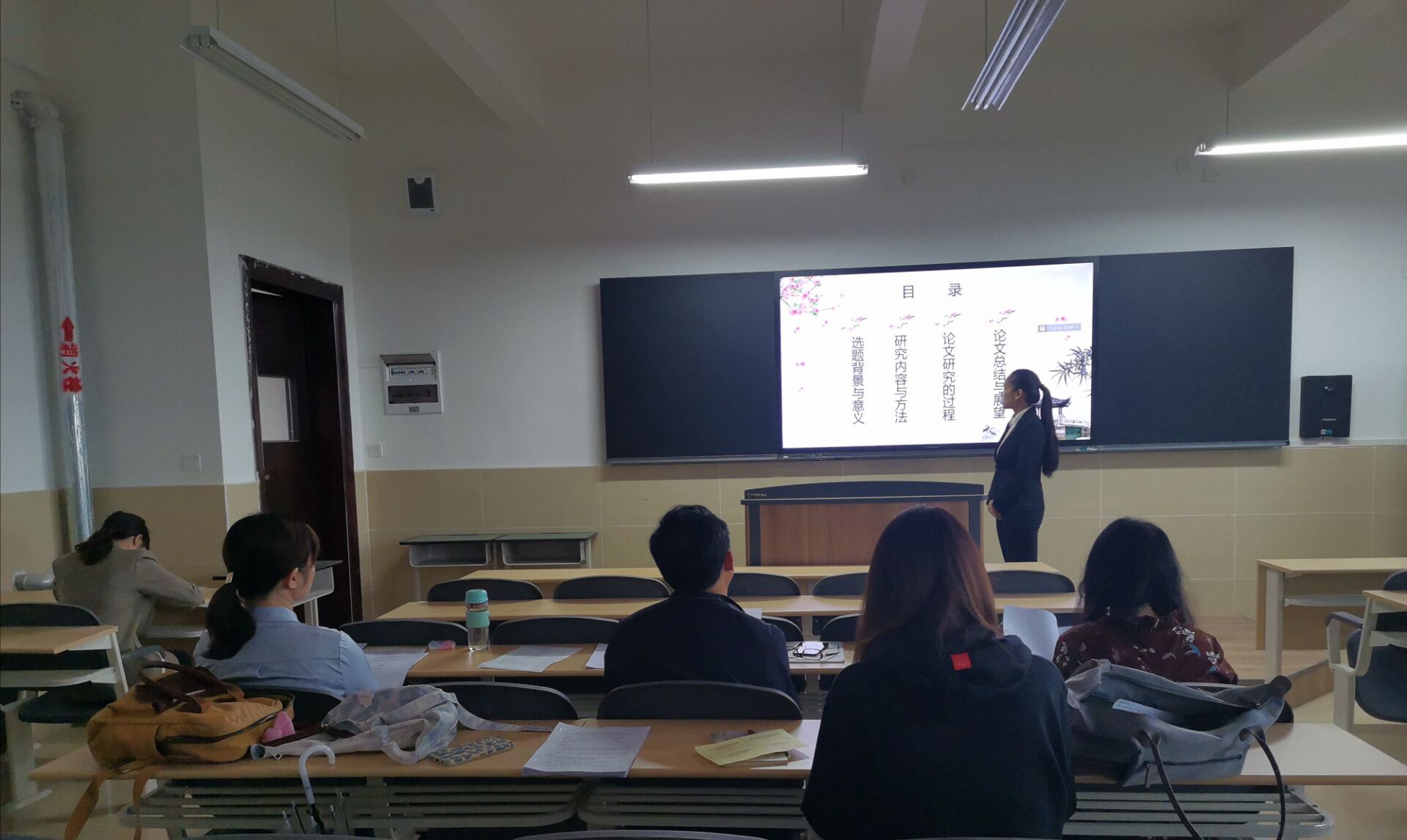 学生们在答辩前都经过了论文开题、中期检查、最终论文审查等几个阶段精心的准备,以至于他们在答辩过程中以图文并茂的形式,结合ppt阐述自己论文的选题目的、理论框架、研究问题的方法及其实际意义。