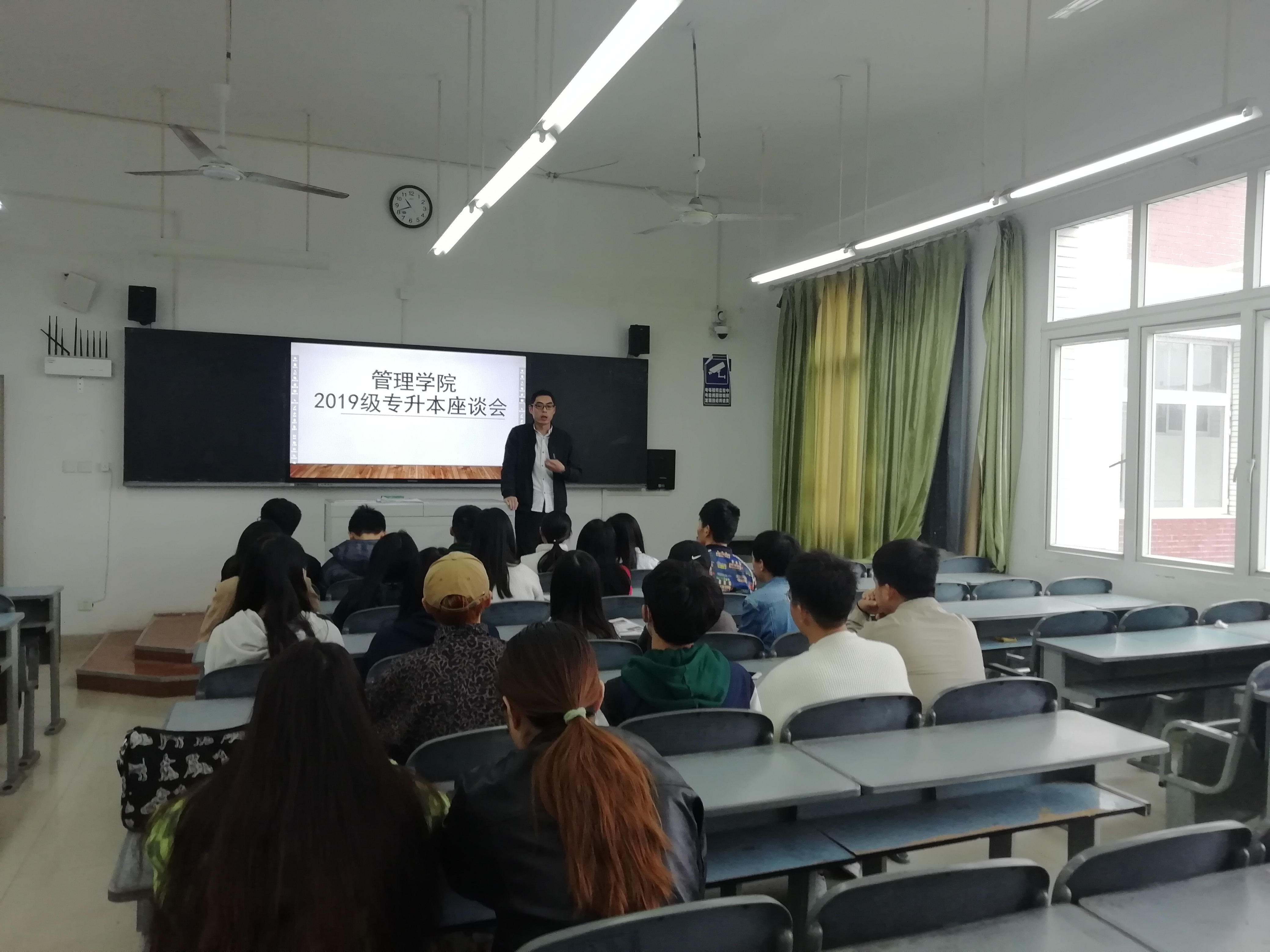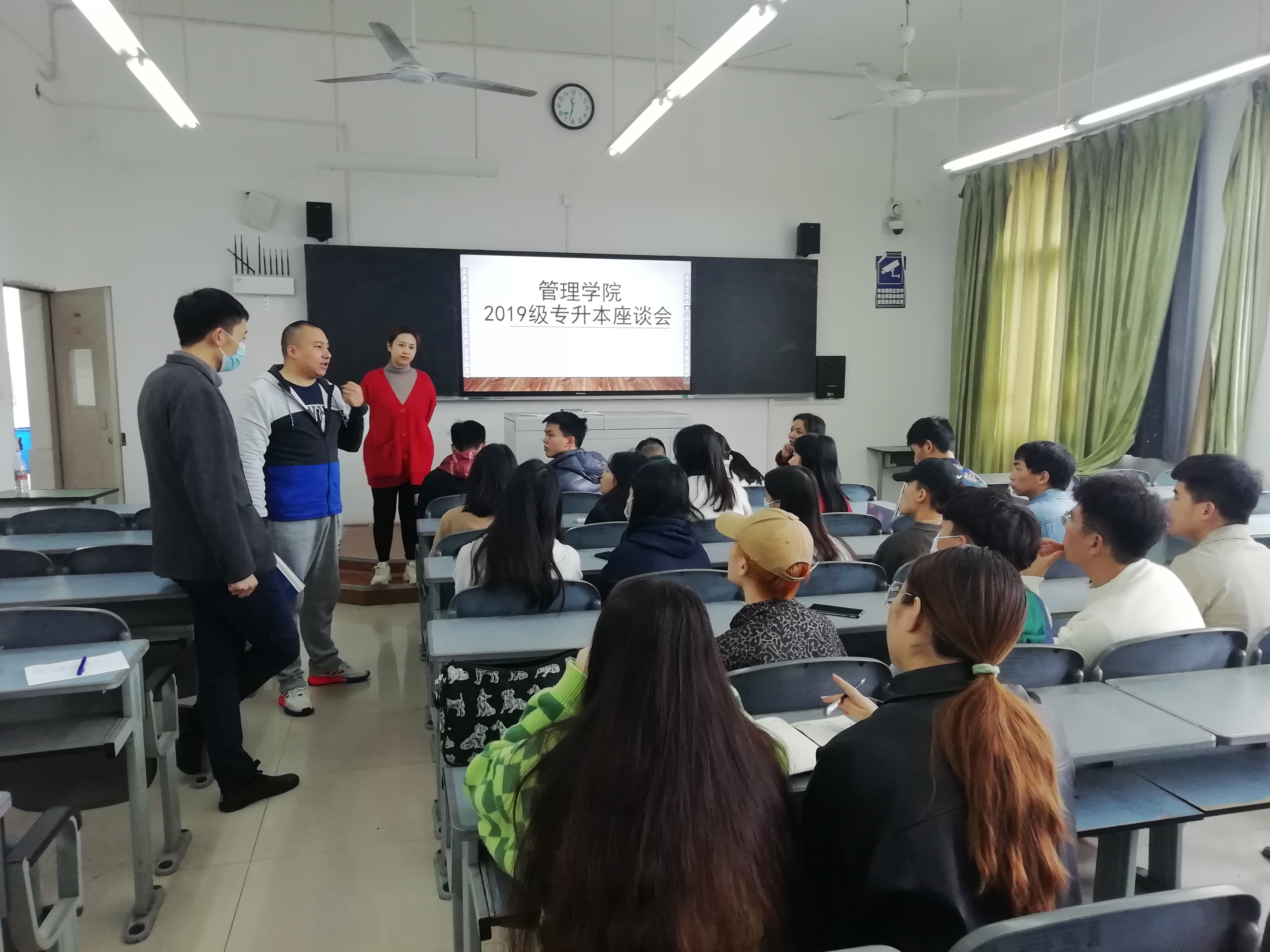 10月22日上午10点,管理学院党总支书记、院长王进、副院长熊清明、院长助理王波、就业实习实训干事刘雪娇,教学办副主任谢健以及管理学院2019级专升本国际经济与贸易、物流管理、电子商务、旅游管理、酒店管理的班干部、代表学生在6-303举行了2019级专升本学生英语、数学等公共课学习问题座谈会。
