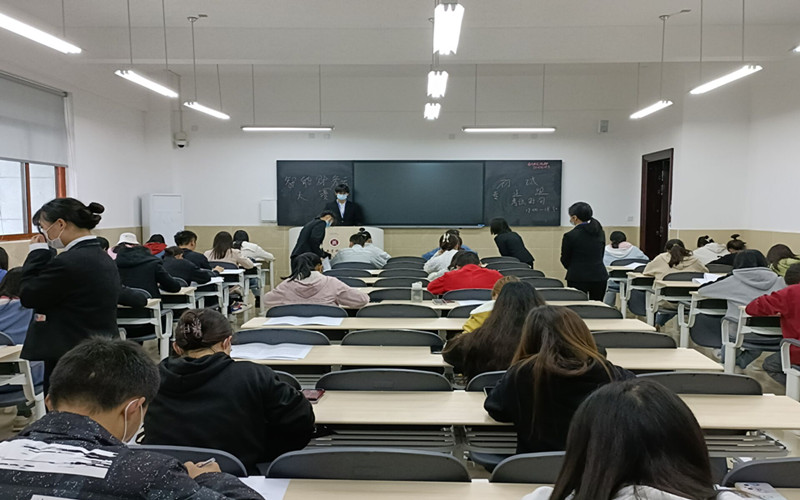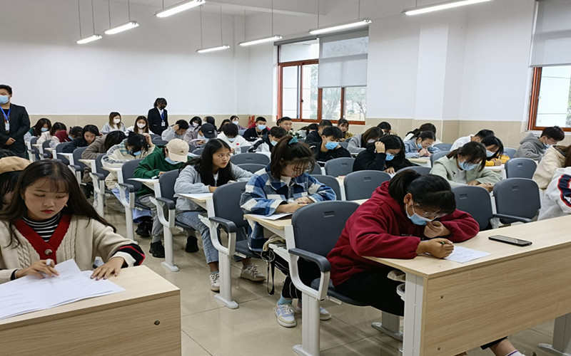 肃穆的考场中,参试的同学端正态度,沉着冷静应考,只听见沙沙的答卷声。监考的干事们尽职尽责,目光和脚步不时出现在考室的各个位置,在减少噪声的同时,也保证着考试的质量。时间缓步推进,本场考试已经到了尾声,参赛人员陆续交卷,踏着轻松的步子离开考场。