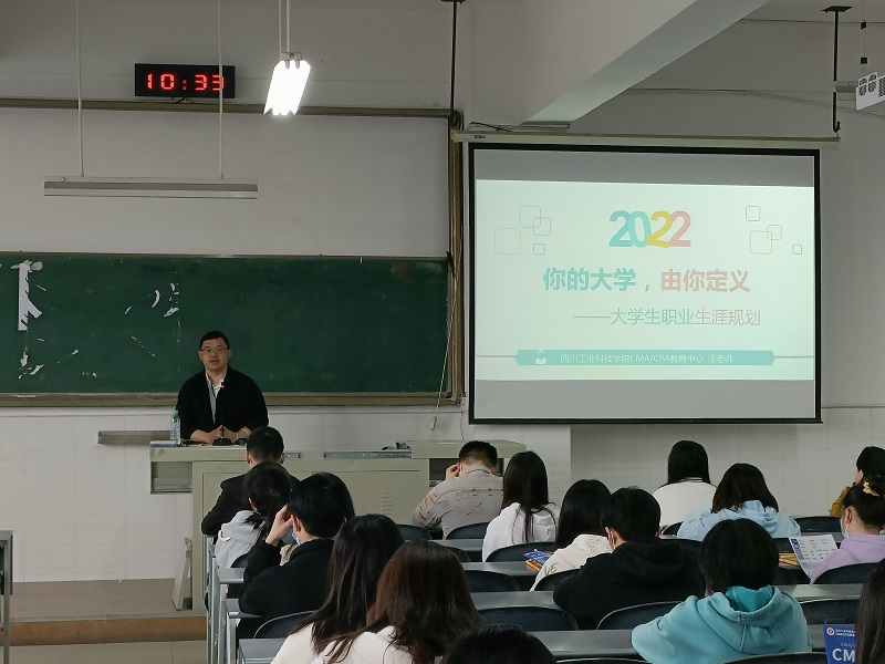 为引导同学们正确定位自身发展方向,合理规划并利用大学时光,提高自身的综合素质和就业能力。3月9号上午,财经学院在毓秀306教室举办了“大学生职业生涯规划”讲座。本次讲座主讲人为四川工业科技学院CMA/CPA教育中心的汪老师,学院学工办主任兼培训班主任张照明以及财经学院21级本科全体学生参加本次讲座。