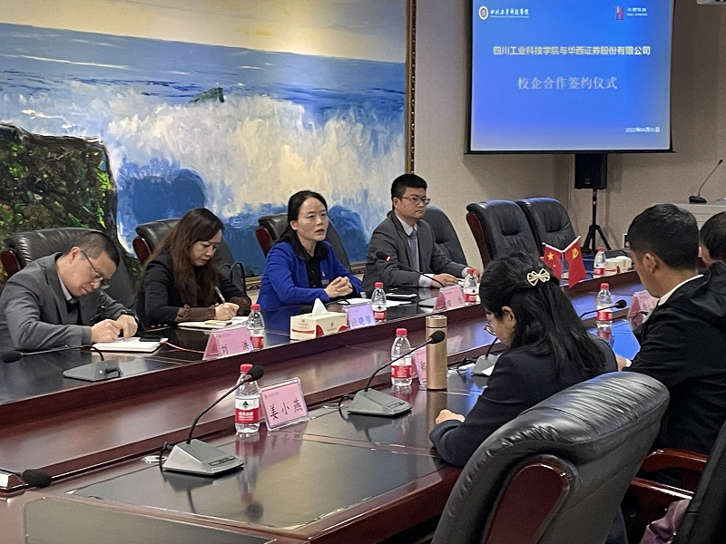 学校为通过和企业合作,实现资源共享、优势互补,共同发展。4月1日上午,四川工业科技学院与华西证券股份有限公司在图书馆401举行了签约仪式。田均、颜晓丽等四位华西证券的代表,副校长郭桂萍,财经学院院长魏顺泽,党总支副书记杨永岗以及财经学院相关老师参加了此次签约仪式。会议由财经学院副院长郑建主持。